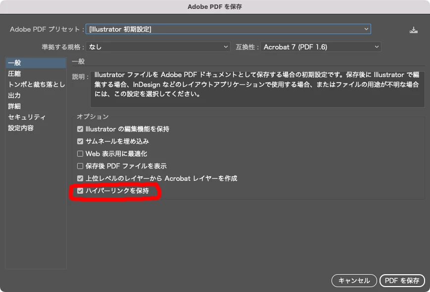 ただ、PDFにするときにハイパーリンクの保持という項目がありません。と言いますか表示頂いた同じような画面がありません。