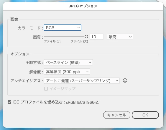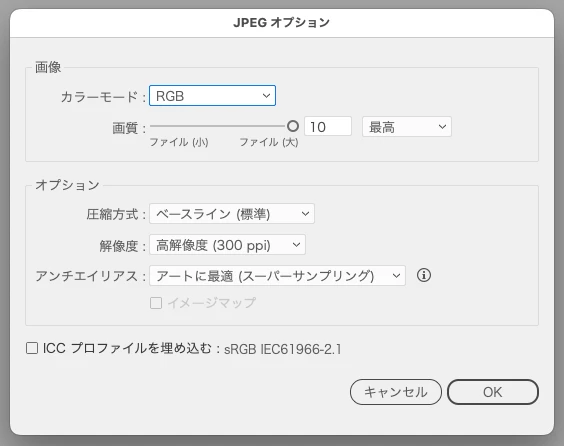 書き出し時に、JEPG、最高画質、アートに最適を選択していますが、