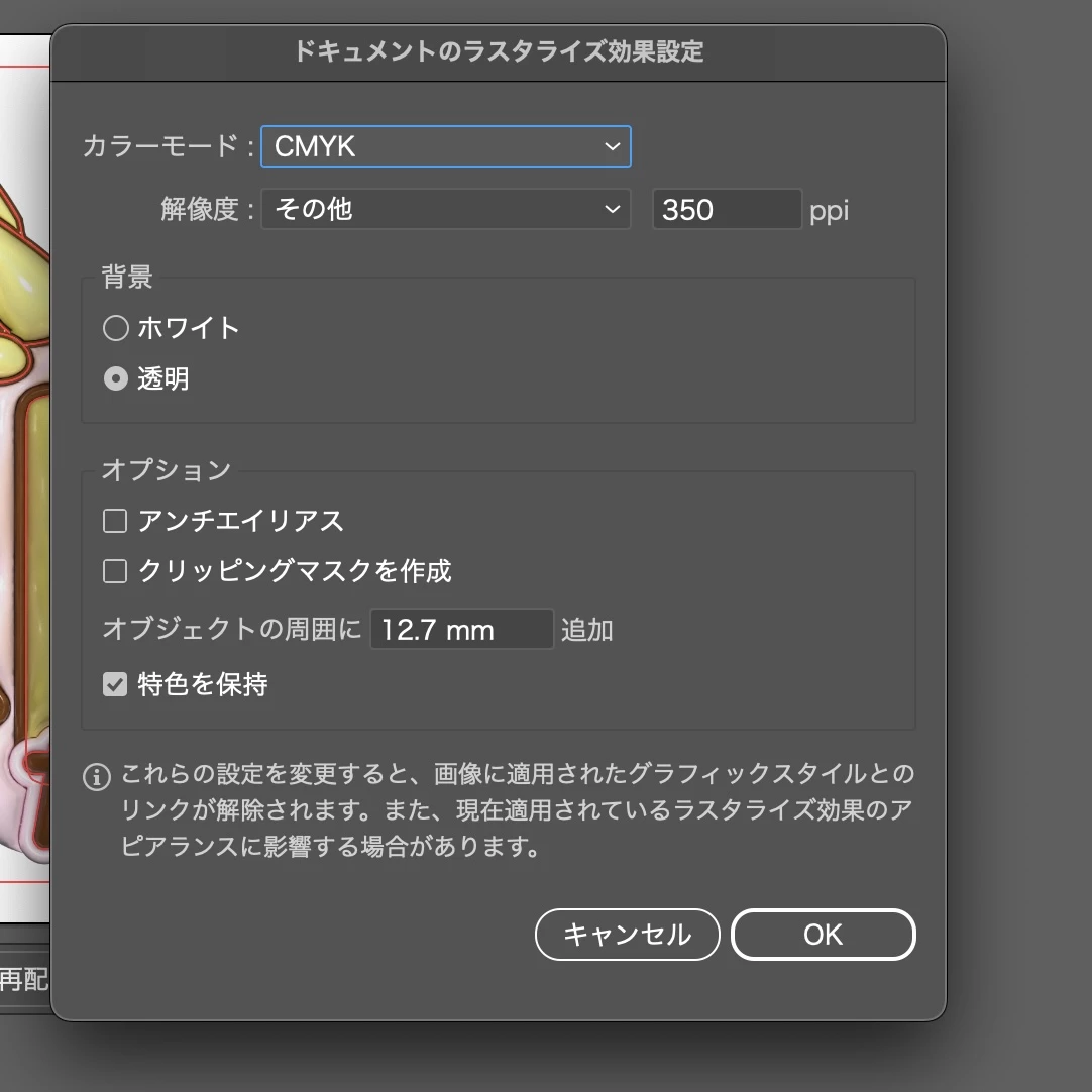ドキュメントのラスタライズ効果設定が高解像度300になっている時の