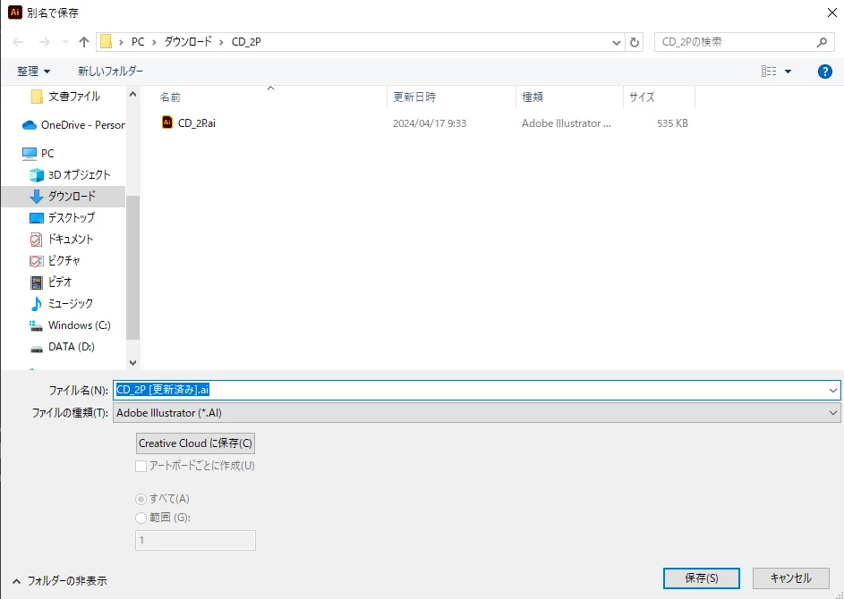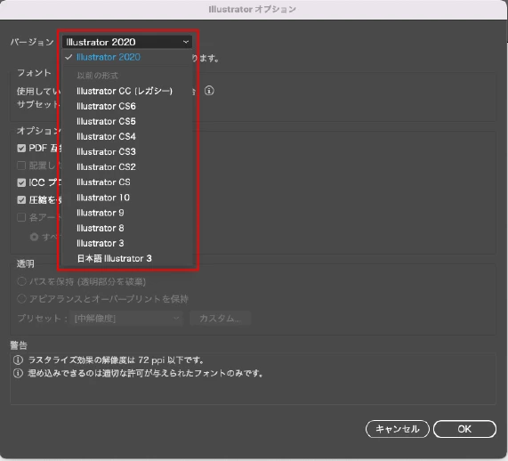イラストレーターの保存バージョンなどを選択する画面が表示されない。
