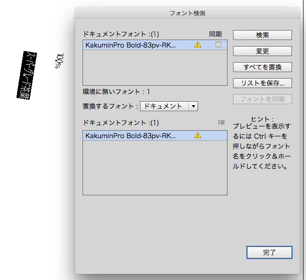 今回の例でいうと「KakuminPro Bold-83pv-RKSJ-H」で検索したのですが、Windowsっぽいフォントのようで、OSXの手持ちのモリサワ「A-OTF カクミン Pro H,A-OTF カクミン Pro B」をインストールしてもダメでした。