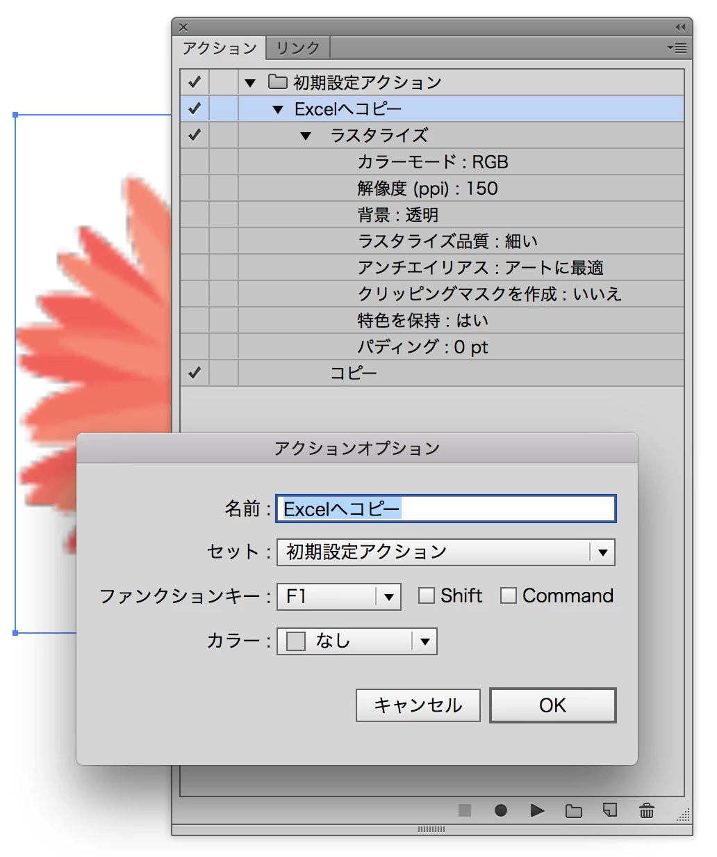 Excelへ持って行きたい図を選択して、メニューのオブジェクトから「ラスタライズ...」を選び、条件を設定すると、図がラスタライズ(画像化)され、同時にアクションに実行した内容が記録されます。