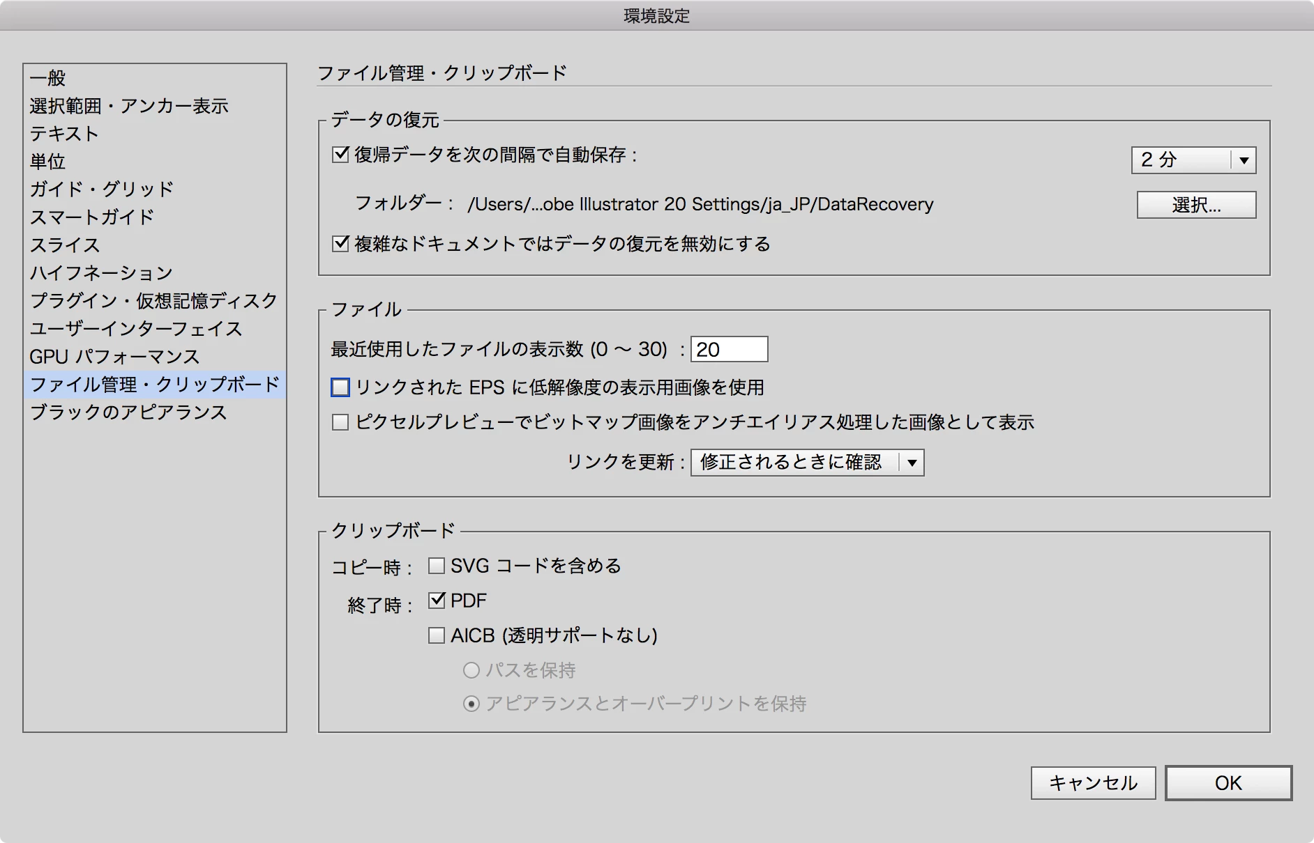 それと、Illustratorのバージョンによって表示が違うかもしれませんが、環境設定のファイル管理・クリップボードの設定で、「SVG コードを含める」のチェックを外し、「PDF」にだけチェックを入れた状態にしておいた方がよいかもしれません。
