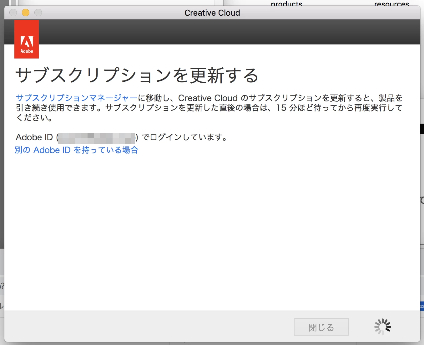 イラレを立ち上げようとしたらクリエィティブクラウドが「サブスプリクションを更新せよ」と表記してきました。そこで確認すると、ログインしているのが以前のIDのままでした。