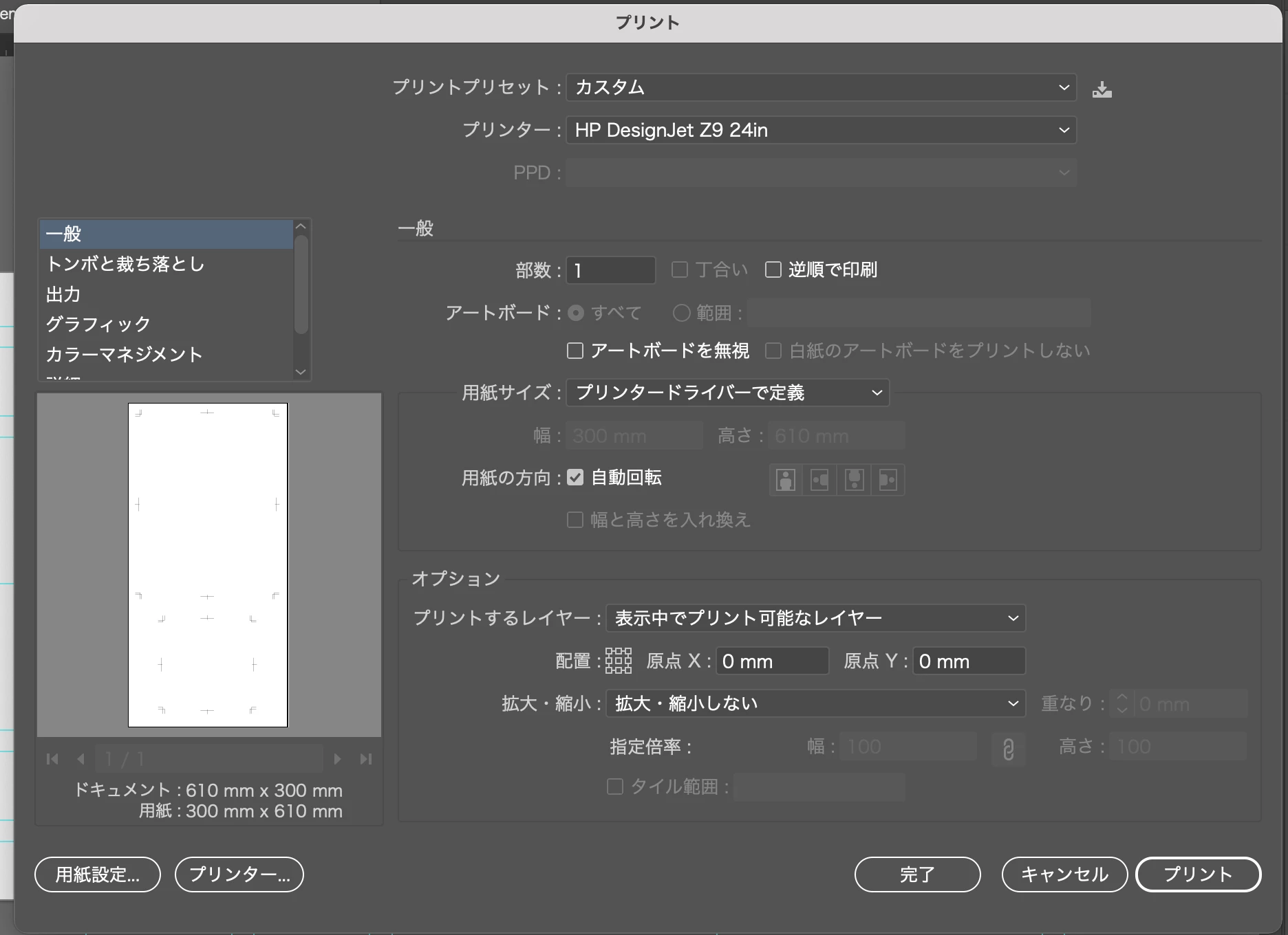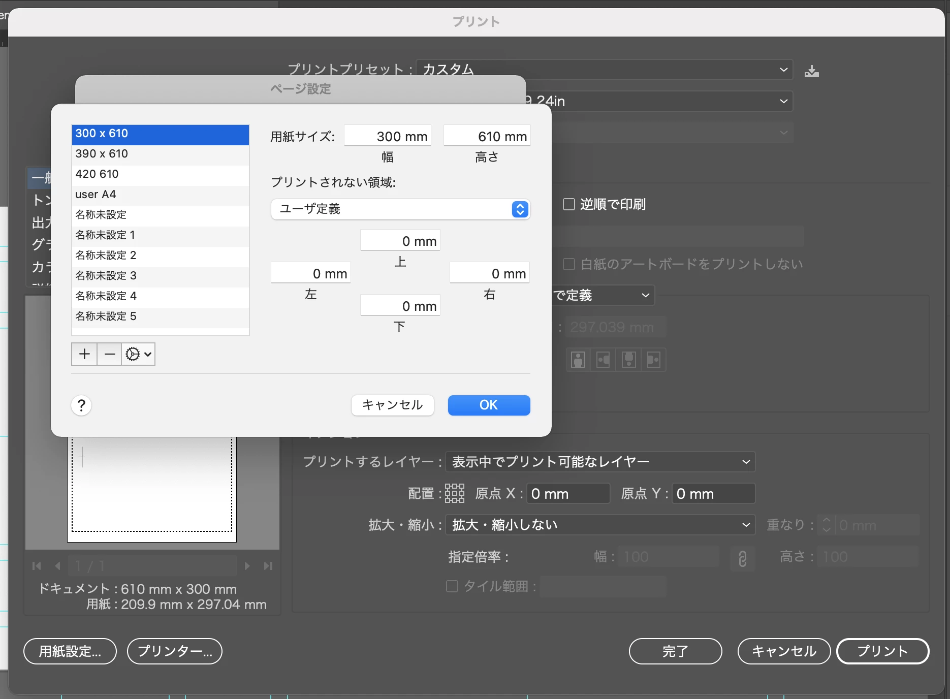 illustratorにて、カスタムサイズ(300mm×600mmなど)で作成したファイルを印刷すると、