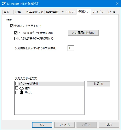 タブで「予測入力」をクリックして「予測入力を使用する」のチェックを外して「OK」ボタンをクリックします。