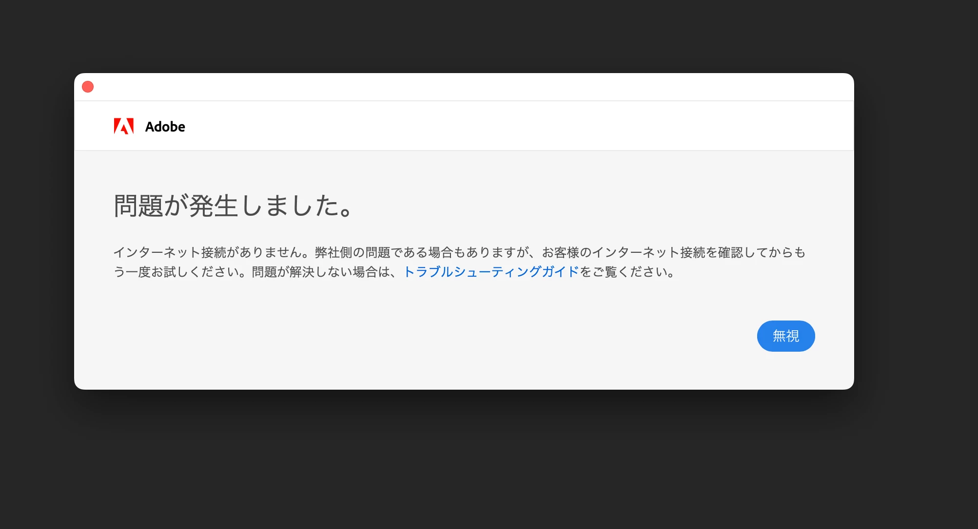 イラレ起動時に「問題が発生しました(インターネット接続がありません。弊社側の問題である場合もありますが、お客様のインターネット接続を確認してからもう一度お試しください。問題が解決しない場合は、トラブルシューティングガイドをご覧ください)」と表示されます。