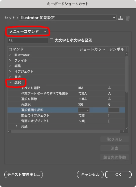 編集メニュー > キーボードショートカット で割り当てることができます。