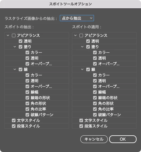 いずれにしても、スポイトツールの挙動はツールをダブルクリックして出る「スポイトツールオプション」の設定に依存するのですが、ここに「テキスト」はありません。なのでエリアテキストに適用した場合、中の文字ではなくガワの長方形に適用されることとなります。