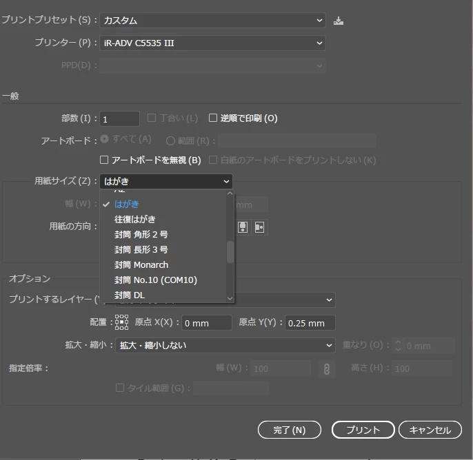 イラレの画面も確認したら、用紙選択ができるようになり印刷できました。