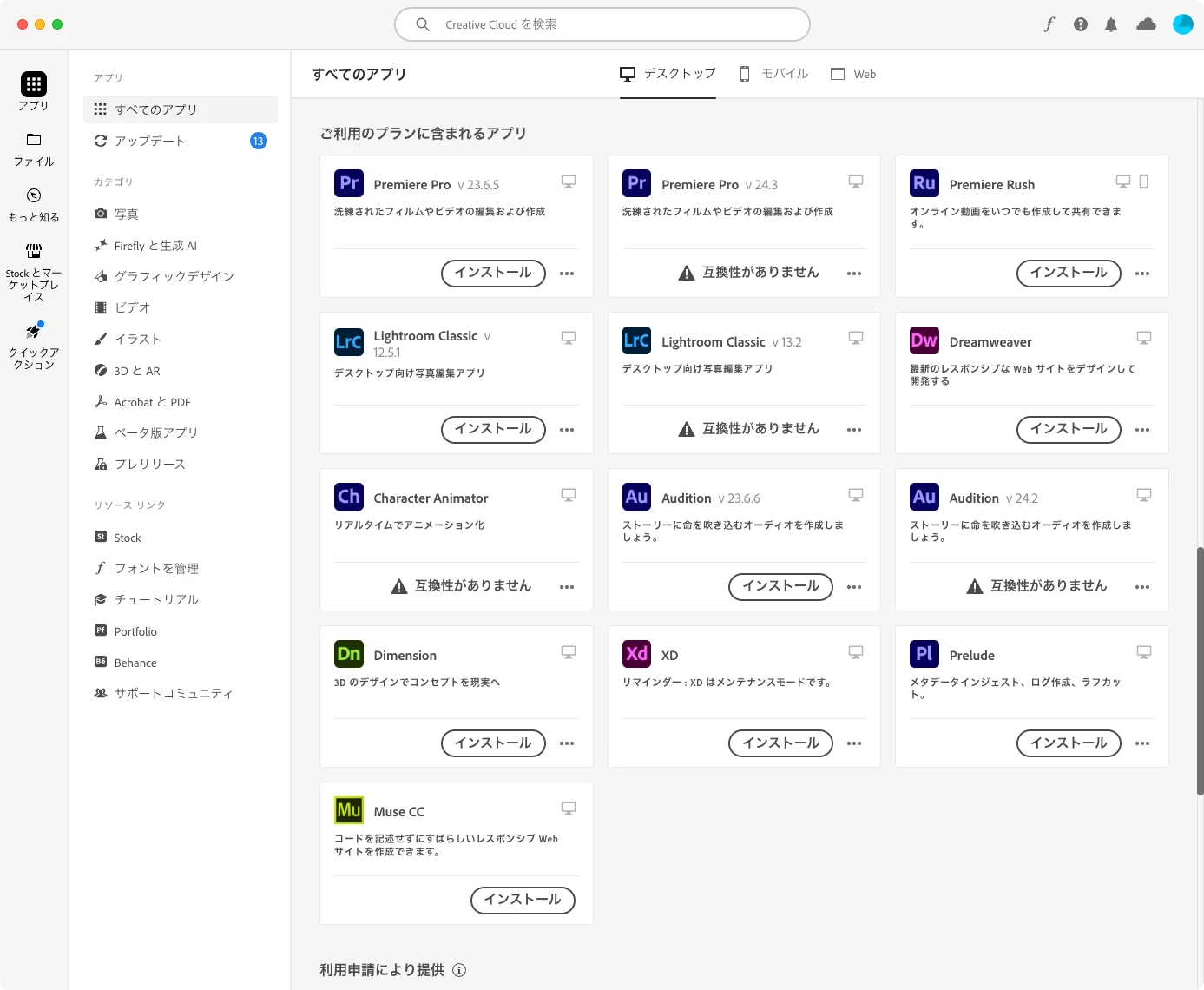 会社からコンプリートプランの権限を与えられたので、ユーザー登録を行った後にフォトショップとイラストレーターをインストールしようと思いました。