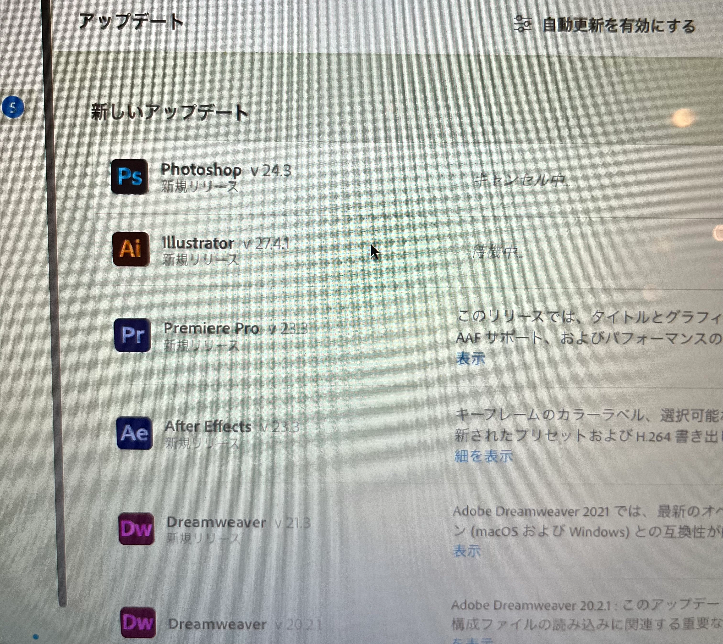 Photoshopは以前使っていたバージョン(2,3年前)のものが使えたいるのですが、これもアップデートがキャンセル中のまま進みません…!