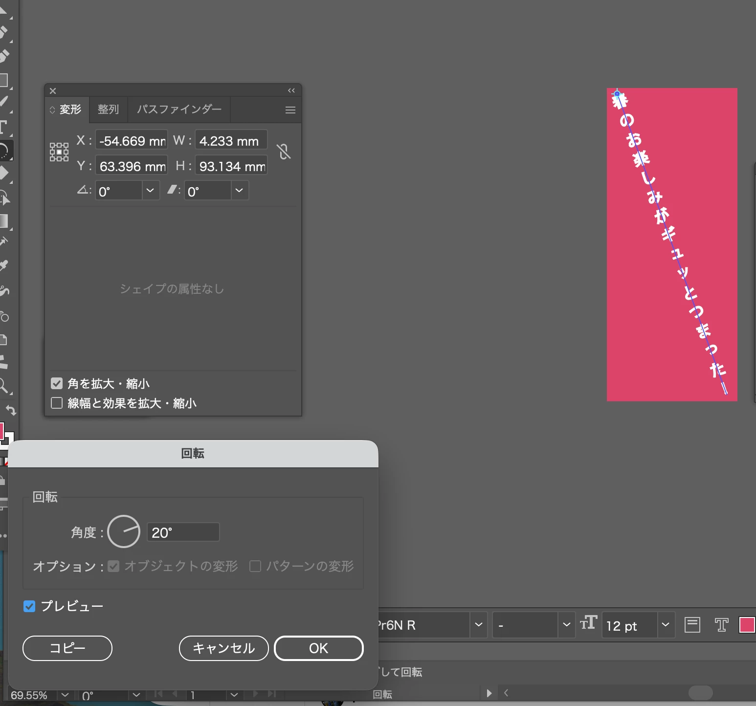 テキストと並行して長方形も回転させたいです(図3)。どのように操作したら良いか、ご教示いただけますと幸いです。