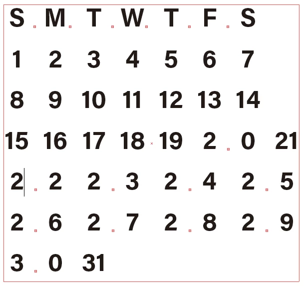 カレンダーを作るのにエリア内文字オプションをしていますが、画像のように途中から数字が正しく反映されなくなります。