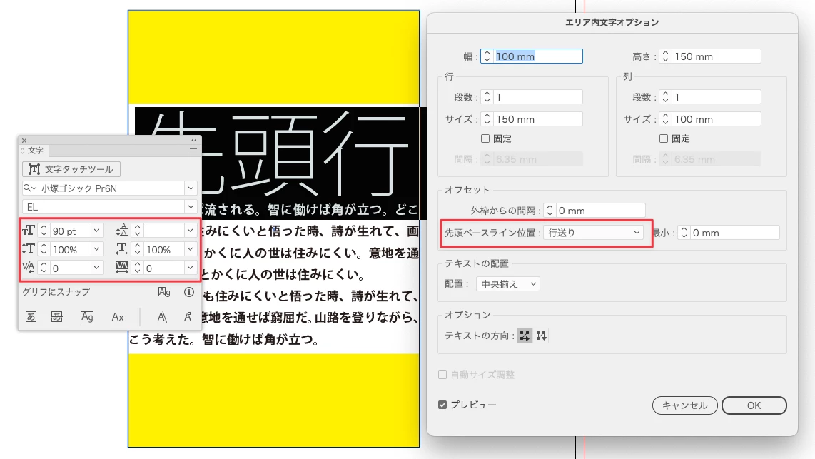 「どこを天にするか」は、「エリア内文字オプション > オフセット > 先頭ベースライン位置」で決まります。
