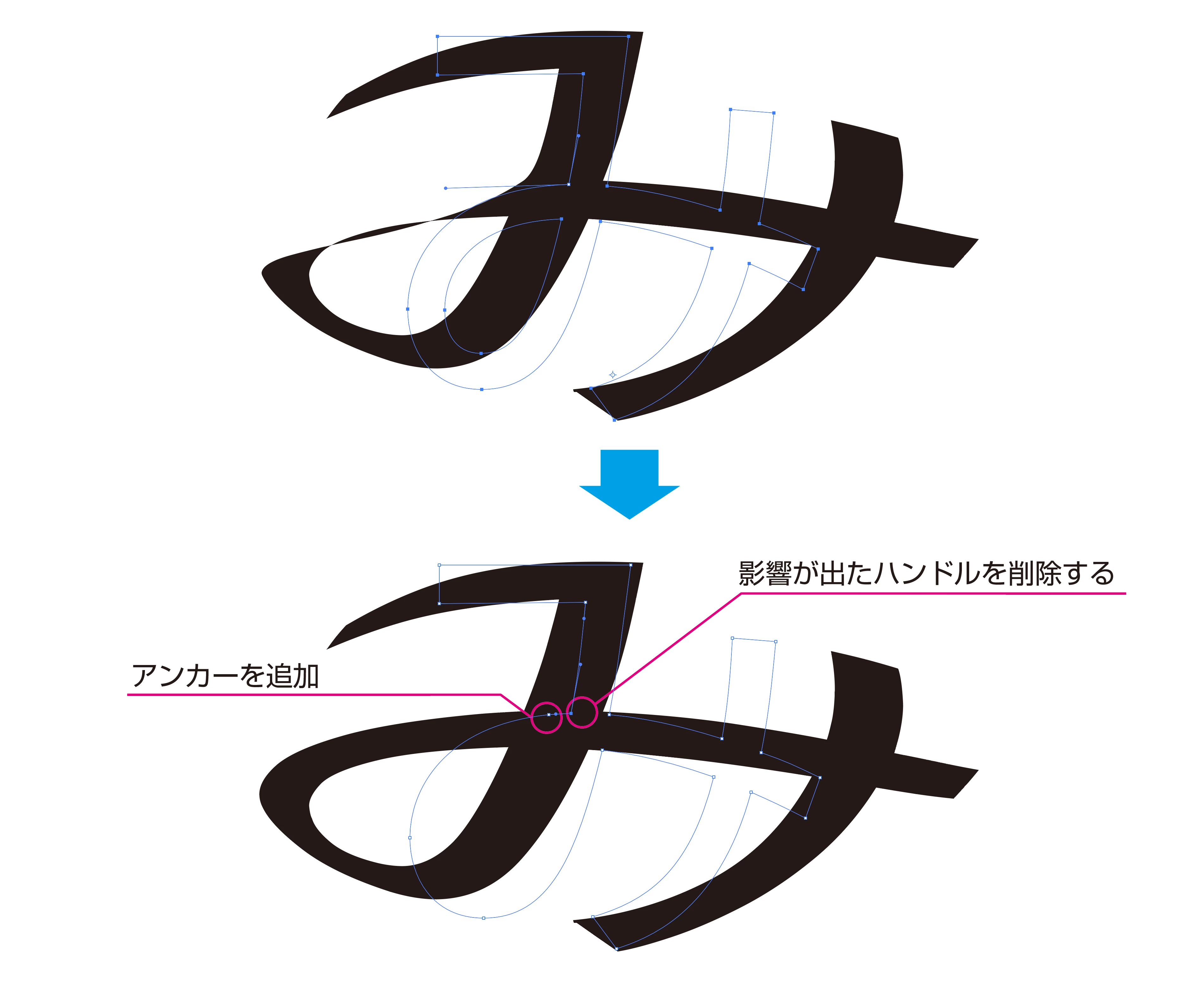 エンベローブ機能にて文字「み」を変形した結果、左側丸みのある箇所でパスの形状が原型と異なる形に変化します。フォントによっては正しく変化する物もある様ですが、これはどのような仕組みでなってしまうのか。また、回避策はありますでしょうか。