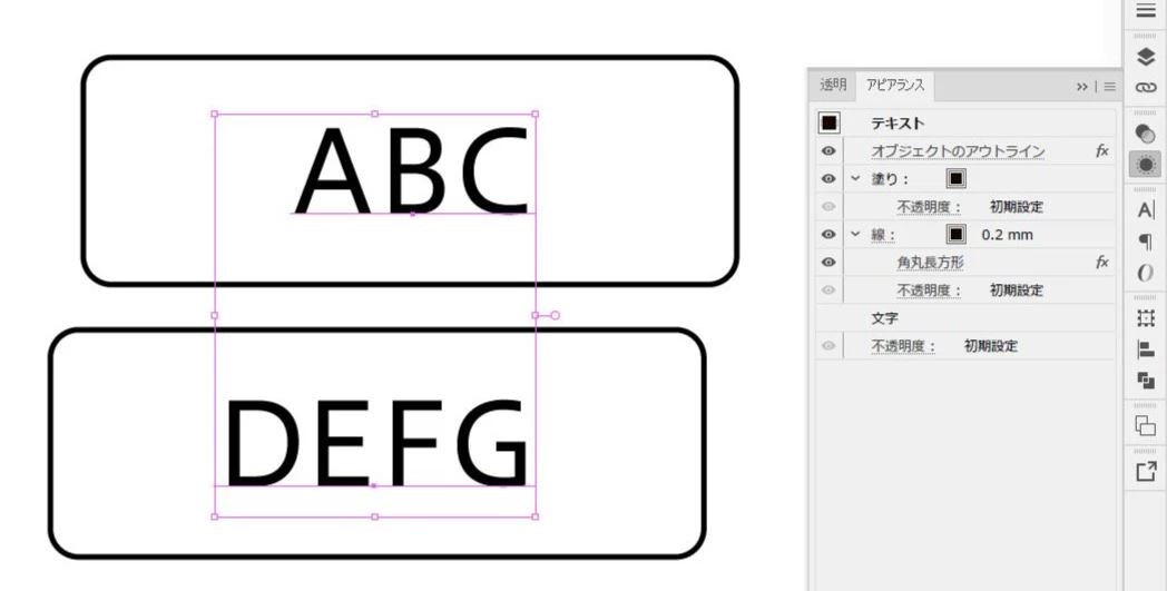 添付の様にアピランス作成オブジェクトが角丸四角が揃わないのです