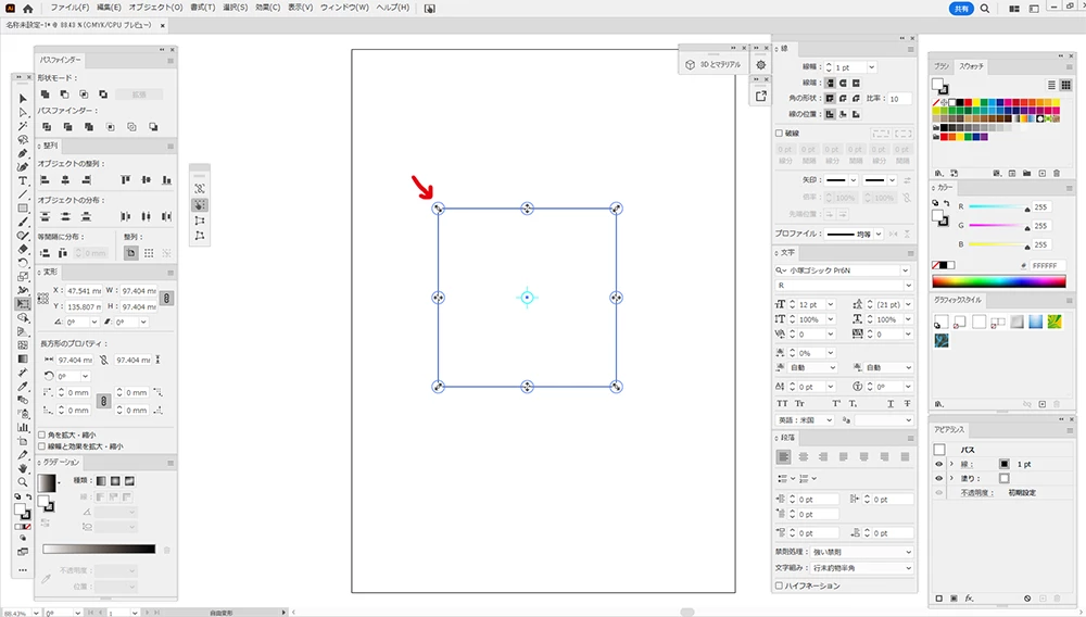 オブジェクトの自由変形で四隅に出てくる大きな円を消す方法を探しています。