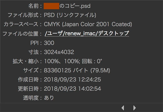 そのpsdファイルのリンクファイル情報を見ると、カラースペースは下の画像のように japan color coated 2001と書かれていました。