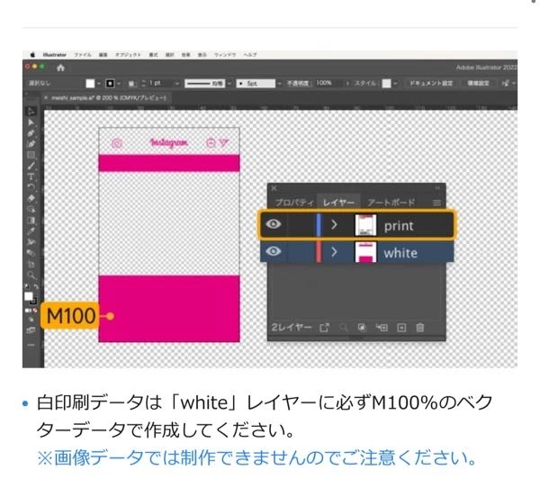 名刺印刷会社のホームページには白印刷データはレイヤーに必ずM100%のベクターデータで作成と書いてあるのですがいくら検索してもやり方がわかりません。