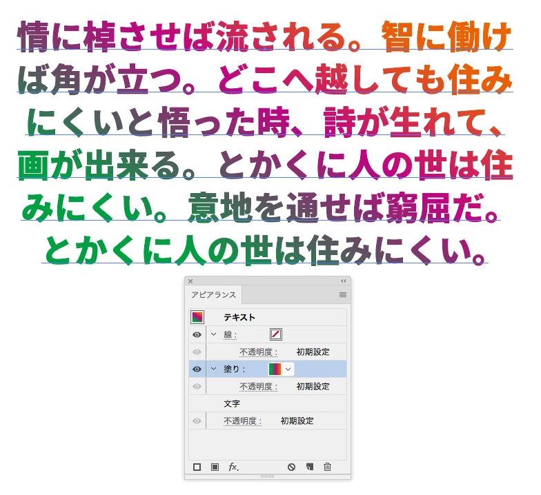 下の絵のグラデーションを使った文字が出来上がるのですが、文字の体裁がくずれます。
