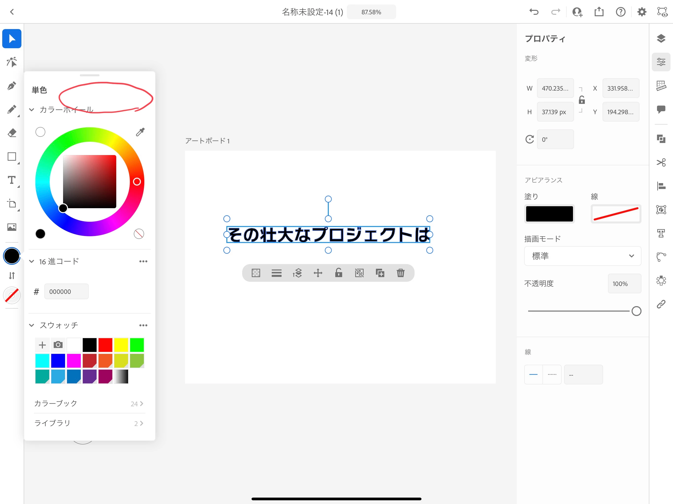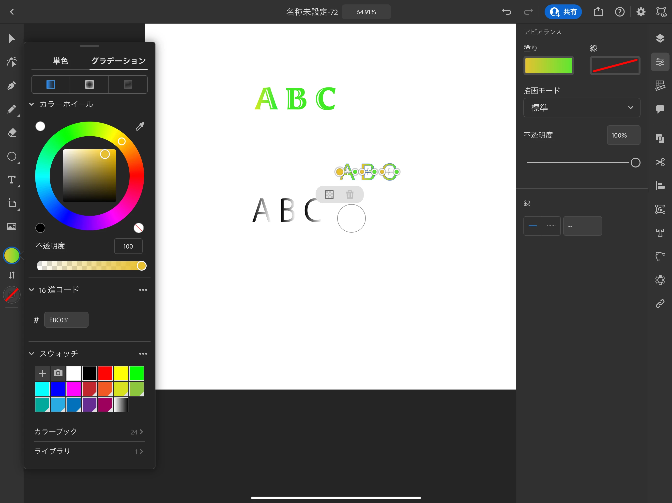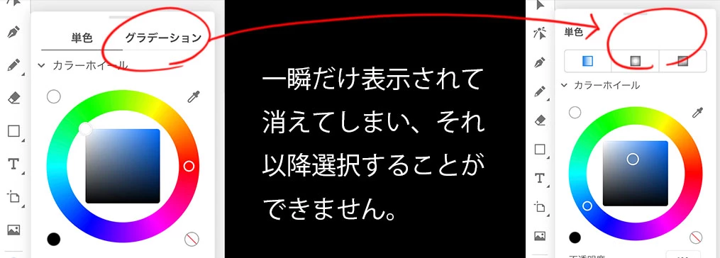 HARAHITOParticipantForum|Forum|4 years agoOctober 7, 2021Questionグラデーションが選択できない (iPad版)Forum|Forum|4 years agoOctober 7, 20211 reply3803 viewsiPad版のイラレ(最新バージョン)でオブジェクのカラーをグラデーションにしたいのですが、塗りを選択すると、[単色]の横に一瞬だけ[グラデーション]が表示されるのですが、消えてしまって選択できません。通常であれば、この[グラデーション]は常に表示されるはずなのですがグラデーションの適用ができない場合のみ非表示になるのか、バグなのかを知りたいと思っています。描画とデザイン
