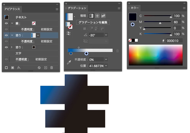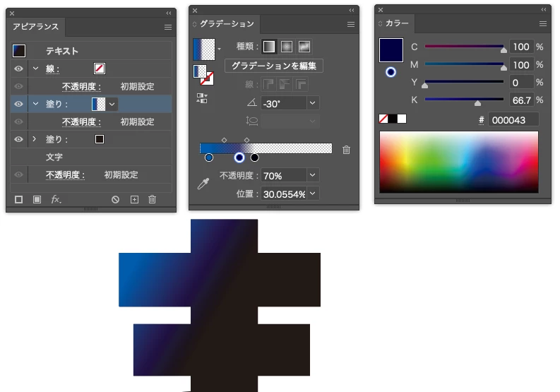 CMYKモードであれば、紺から黒に変化する過程で彩度が低い部分が出るので濁ります。一番簡単な方法は以下のように青から紺のグラデにグレスケールのグラデを乗せる形を作ることです。
