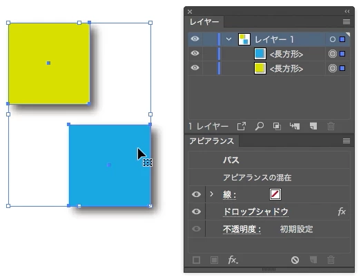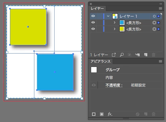 ↑ 2つのオブジェクトをグループ化したものにドロップシャドウを適用したものは、アピアランス部分が無視されたアートボードになってしまいます