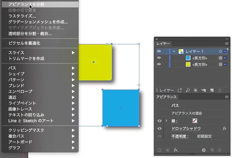 オブジェクトメニューの「アピアランスを分割」