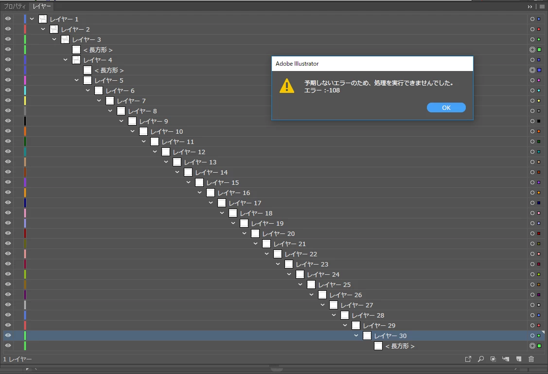 「クリッピングマスクを作成できません。このレイヤーには29のサブレベルがあります。レイヤーの新規作成、グループ化、クリッピングマスクなどの操作はこのレイヤーレベルでは実行できません。続行するには、この階層の既存のレイヤーを減らすか、マージしてください。」