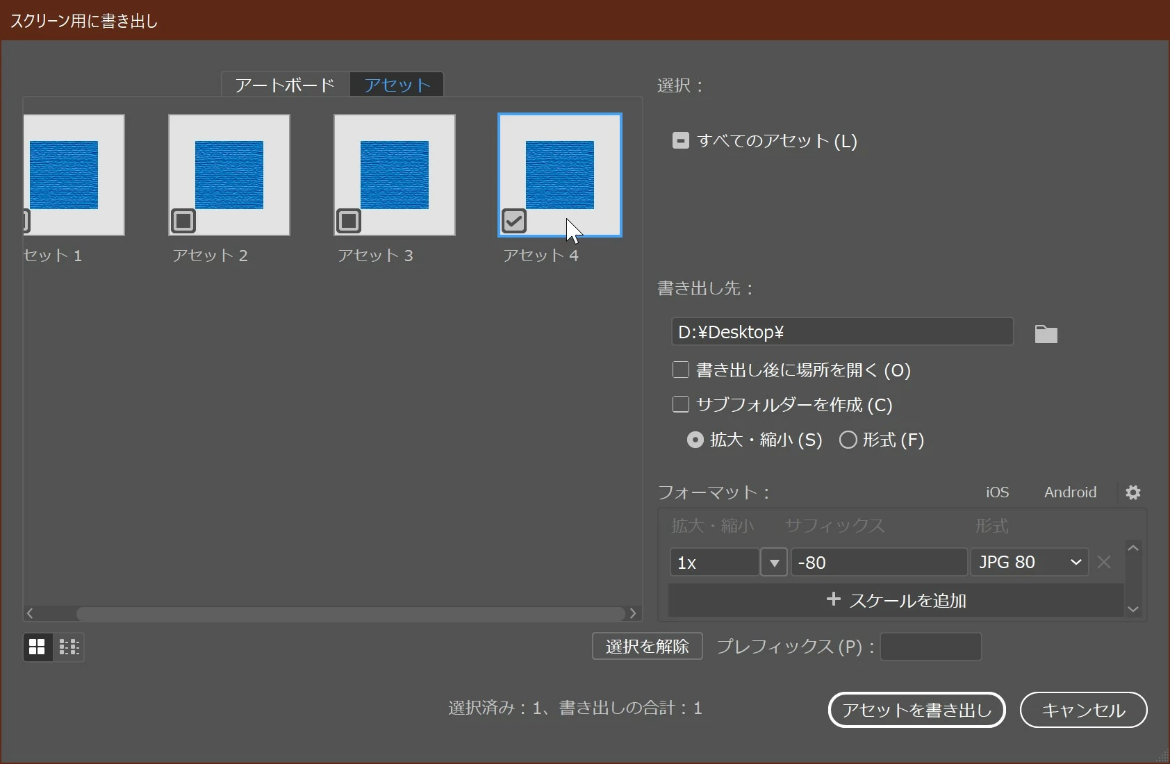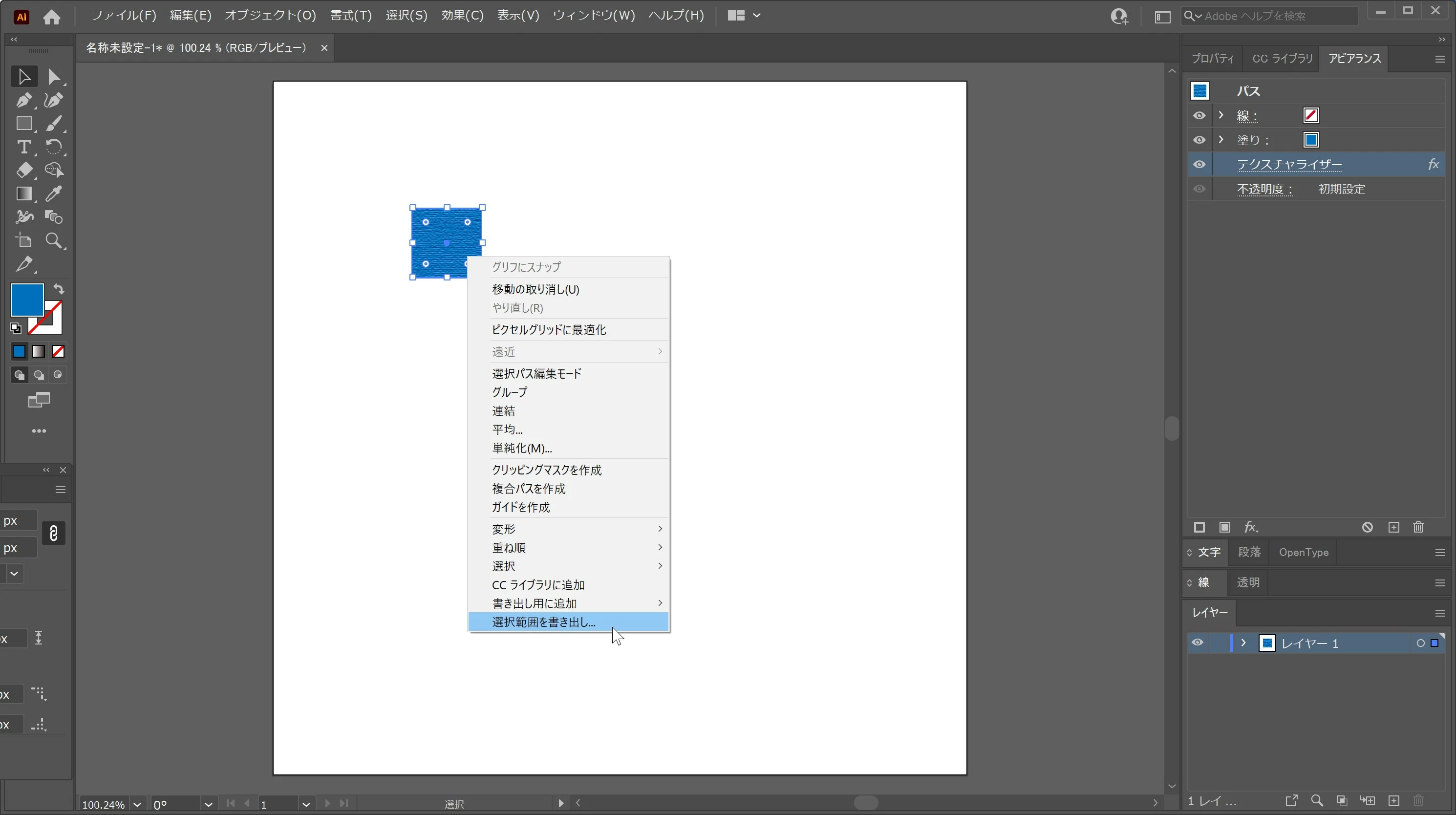 この状態でシェイプを右クリックし、テクスチャの適用された四角を画像ファイルとして書き出すために、「選択範囲を書き出し」を実行しました。