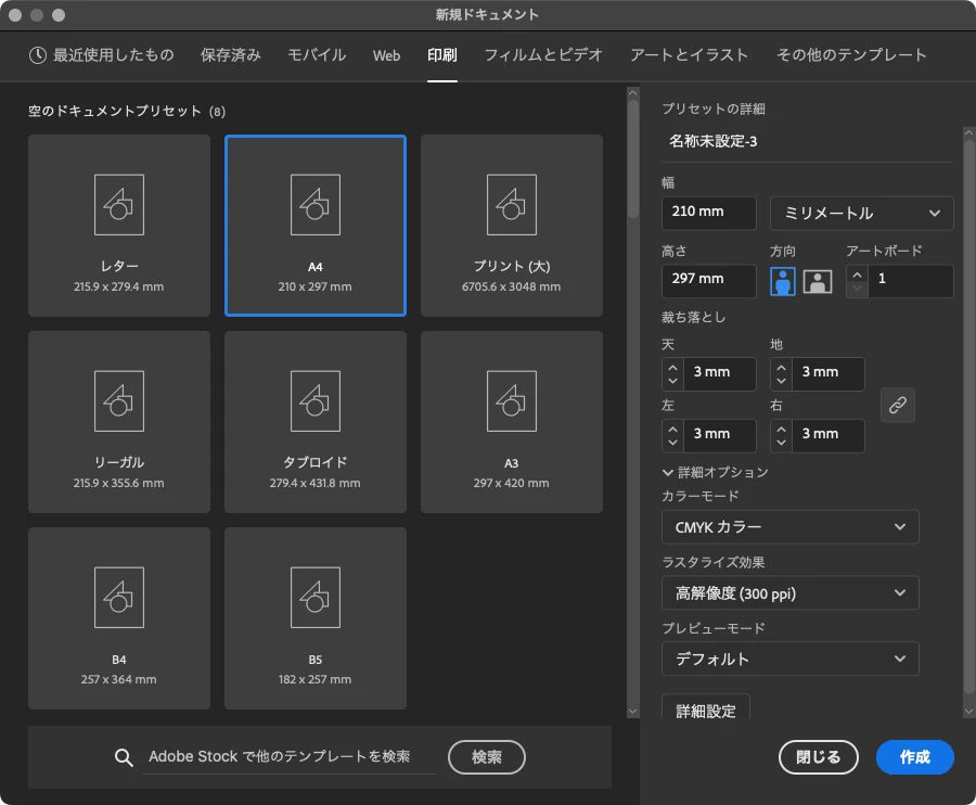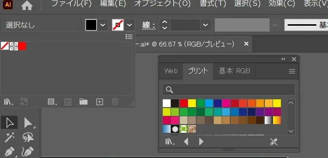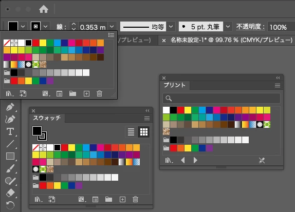 コントロールバーのスウォッチは「現在のドキュメントに連動=スウォッチパネルの表示」ですから新規ドキュメントを印刷タブから開けば下図のようになります。