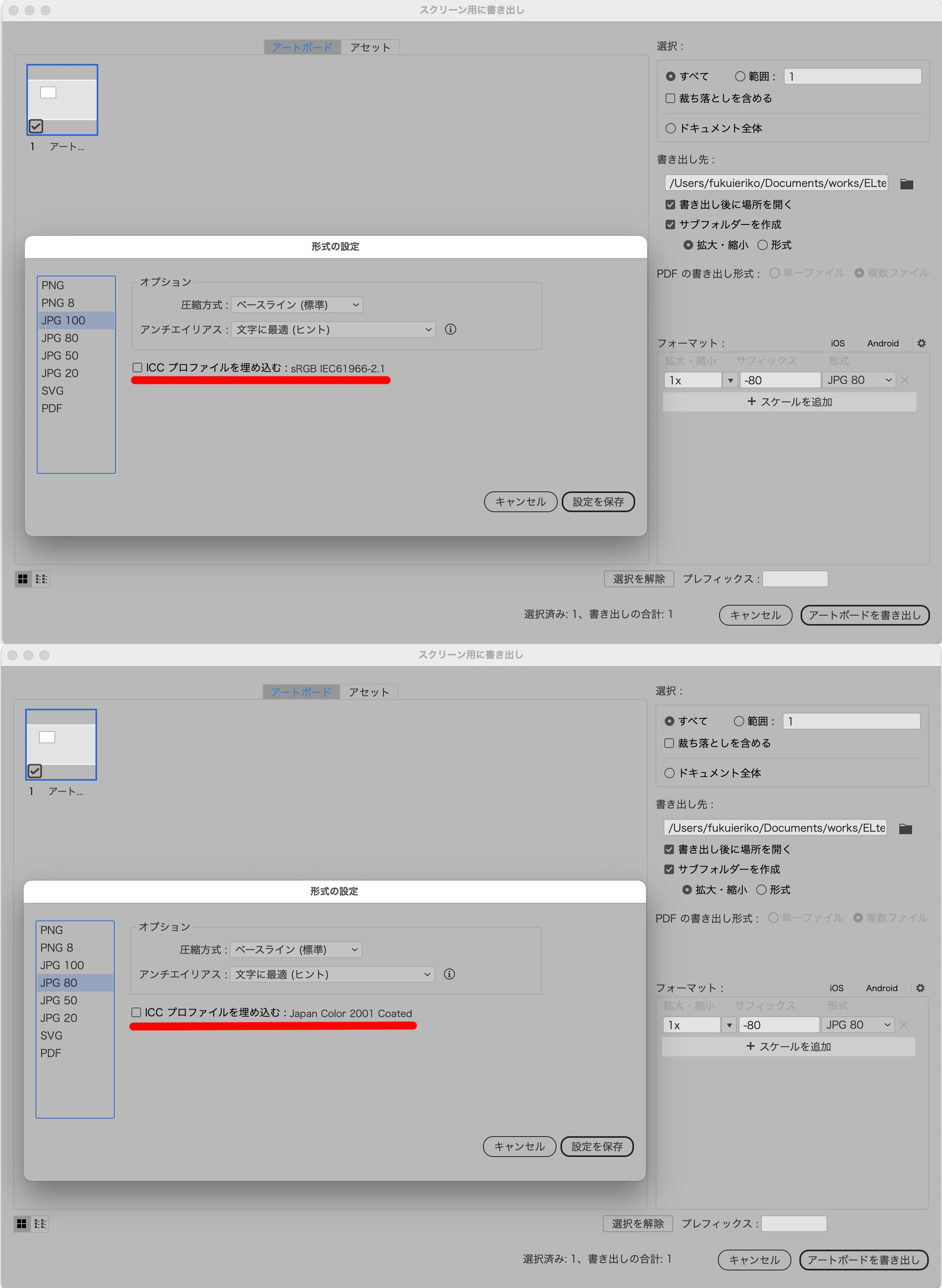 機能の意味合いとしては、『開いているドキュメントと同じプロファイルを、書き出すJPEGファイルにも埋め込む』という設定なので、「JPG100・JPG20・JPG80・JPG50」は、どれも同じなるはずで、現在のef7038さんの状態は、Illustratorの挙動がおかしいのではと思います。