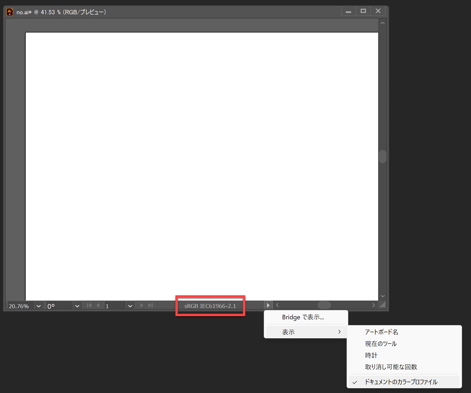 ドキュメントの下にある「表示」を「ドキュメントのカラープロファイル」に変更してみると、現在のドキュメントのプロファイルが確認できます。