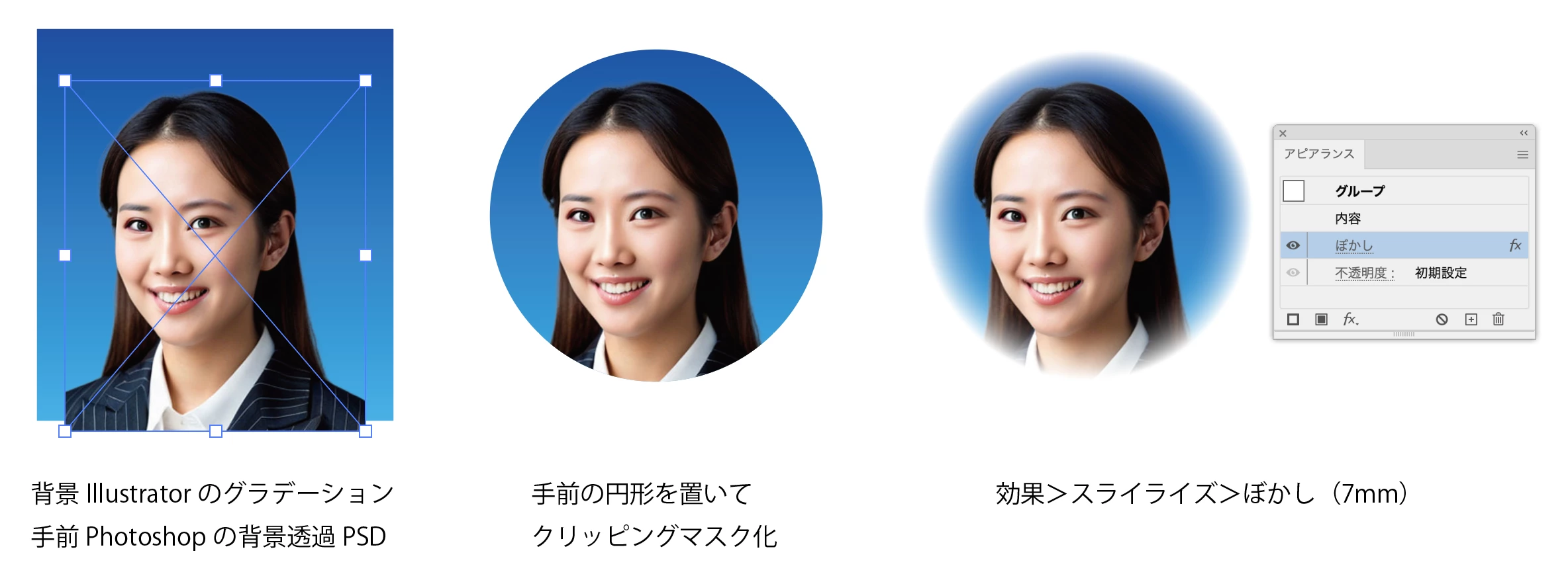 その手順で背景のグラデーションをクリッピングマスクに含めず、背景透過PSDだけでクリッピングマスクしたものにぼかしをかけると、円形以外にも背景透過PSDの人物の輪郭部分にもぼかしができてしまう……という相談でした。