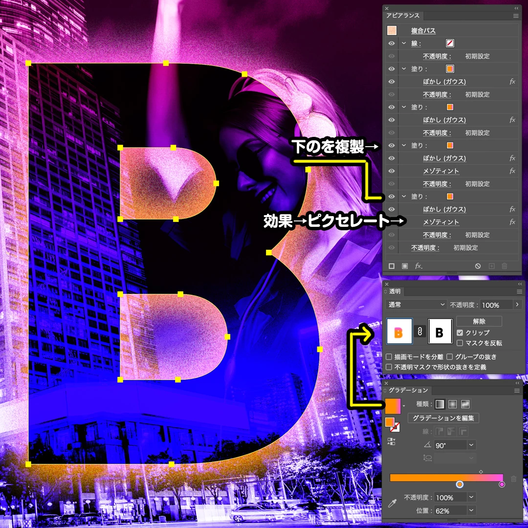 添付画像のように文字の形に抜きつつスパッタリングのようにフチが