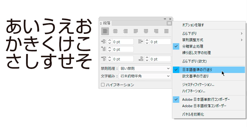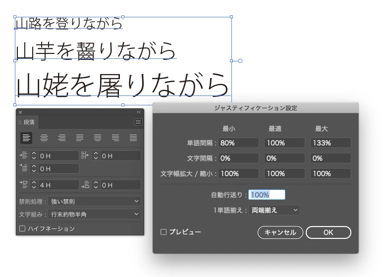 ・段落パネルメニュー「ジャスティフィケーション」で、自動行送りを100%に。
