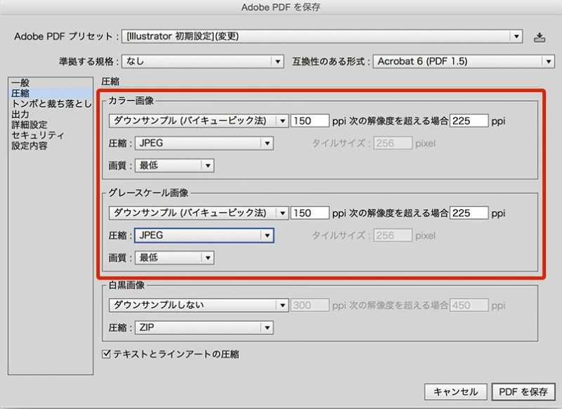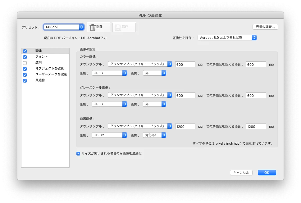これで保存し直すと、PDF内の画像が全てJpeg圧縮され、600ppi以上の物は600ppiに下げられます。