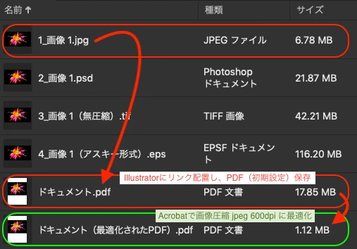 画像をIllustratorに配置しPDF保存するとファイルサイズが膨れ上がる理由は画像フォーマットと容量の話、PostscriptやPDFの話になってきますので、サクッと軽くする方法を書きます。