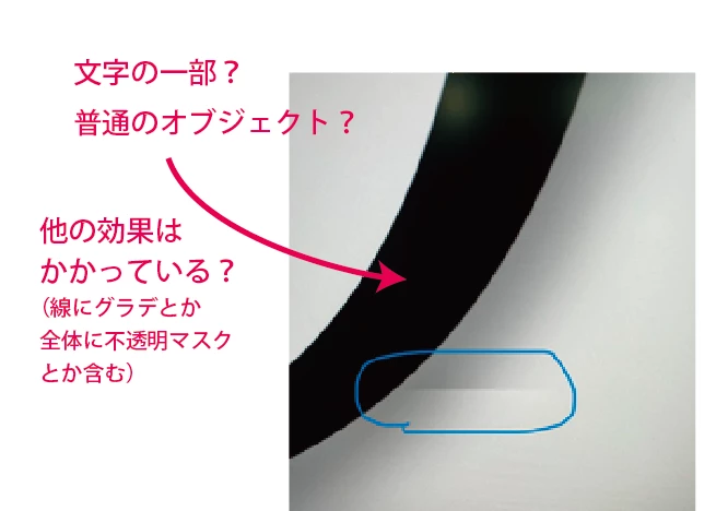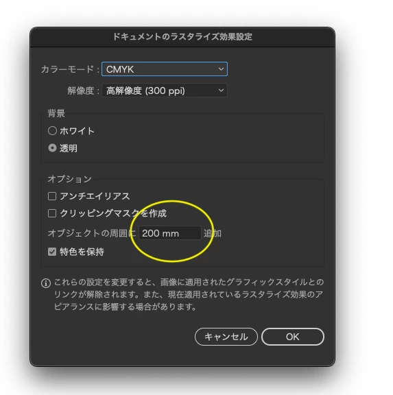 多分、ラスタライズ効果の黄色で丸つけた部分の影響ですね。