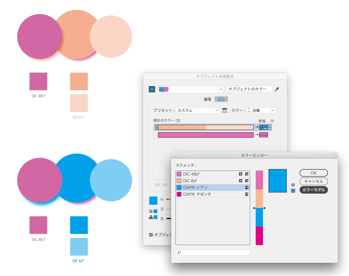 出稿データとしてプロセス(シアンとマゼンタ)に置き換えたデータを作成していたところ、