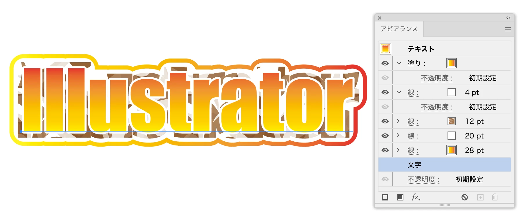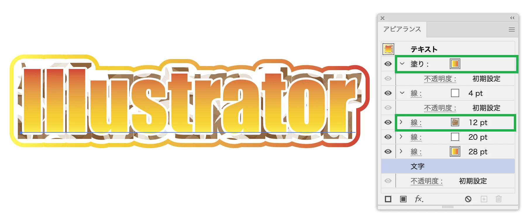アピアランスを使えば、テキストをアウトライン化することなく作成できます(文字の上のハイライトの飾りを除く)。