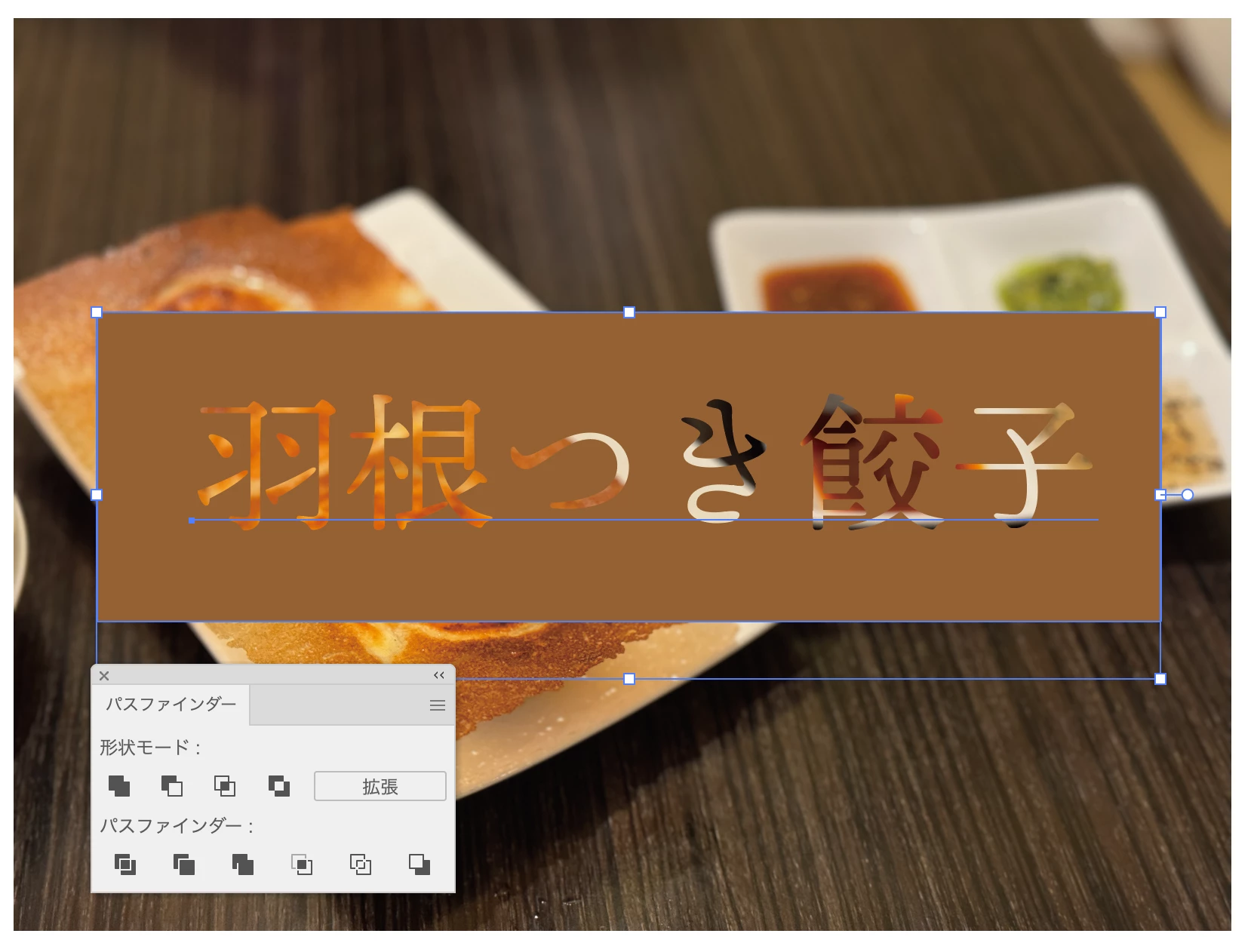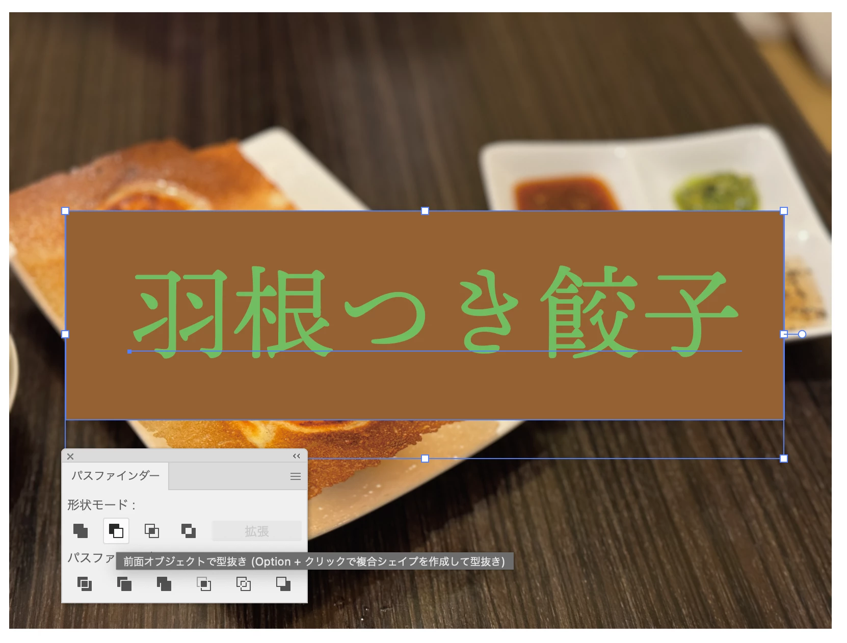 上にある文字が抜けた状態に成ります。文字はそのまま残ってるので打ち替えたりフォントを変えられます。最後の「パスファインダー」パネルの「拡張」をクリックすると文字がアウトライン化された状態に成ります。