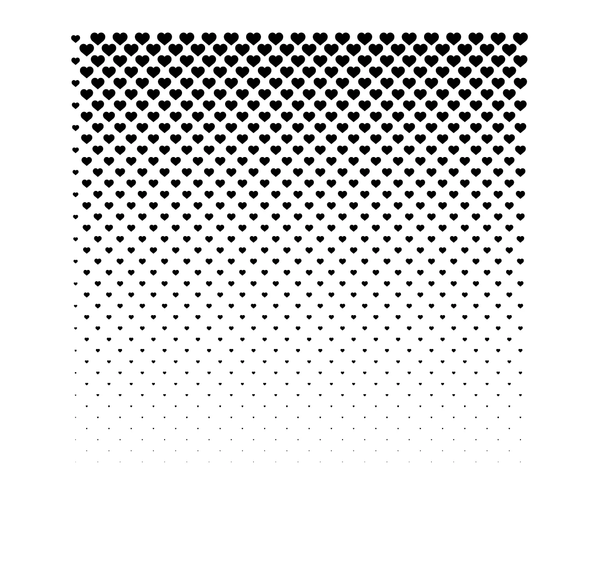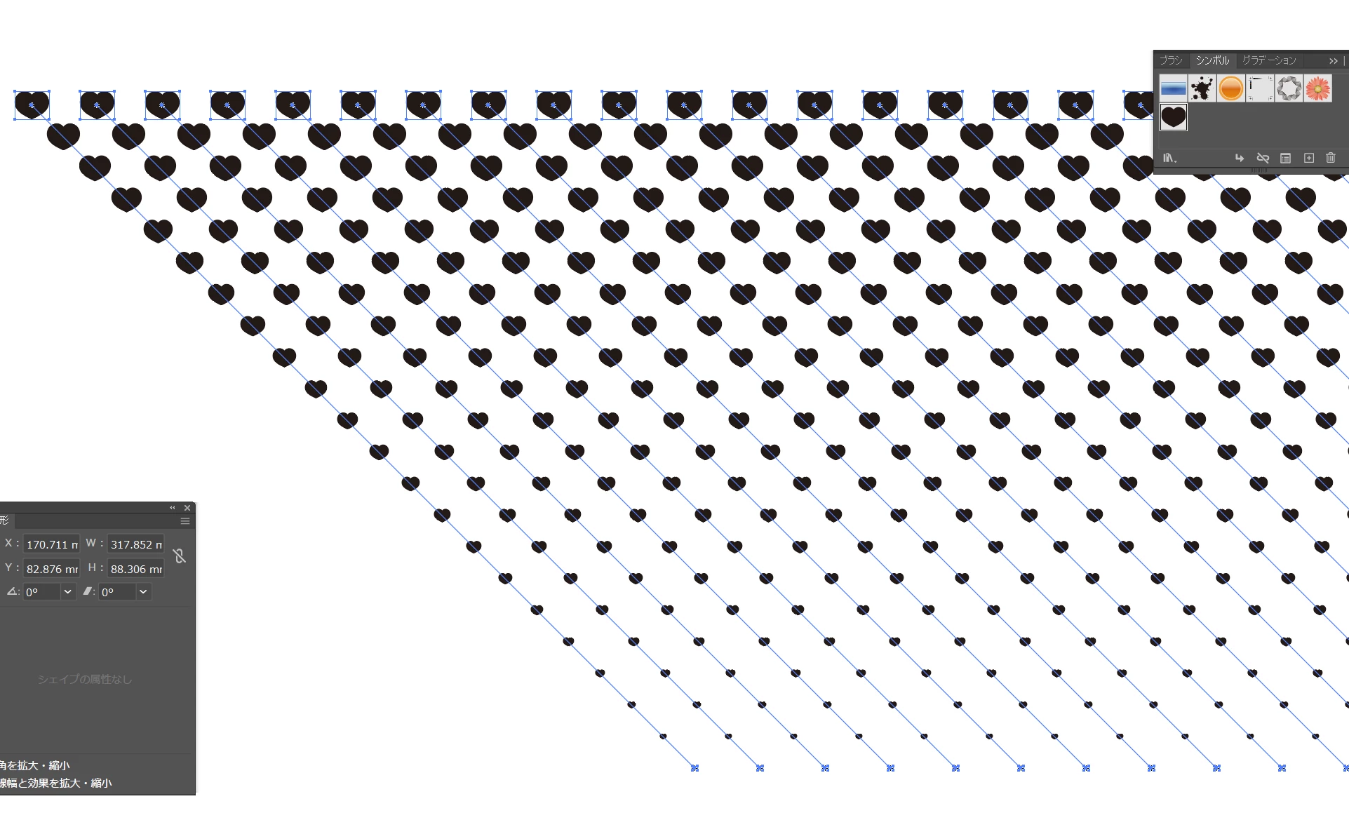 スクリプト使うならハーフトーンパターンの各●をシンボルにサイズ素のままで置換するんですけど、手動でやるならシンボルの上と下のサイズが異なるハートを距離でブレンドしてそのブレンドを水平方向にブレンド距離設定のルート2倍で複製コピーを繰り返しで、そのような状態を再現できます。