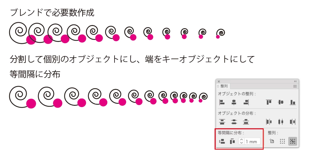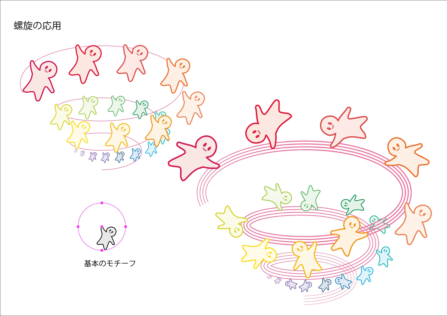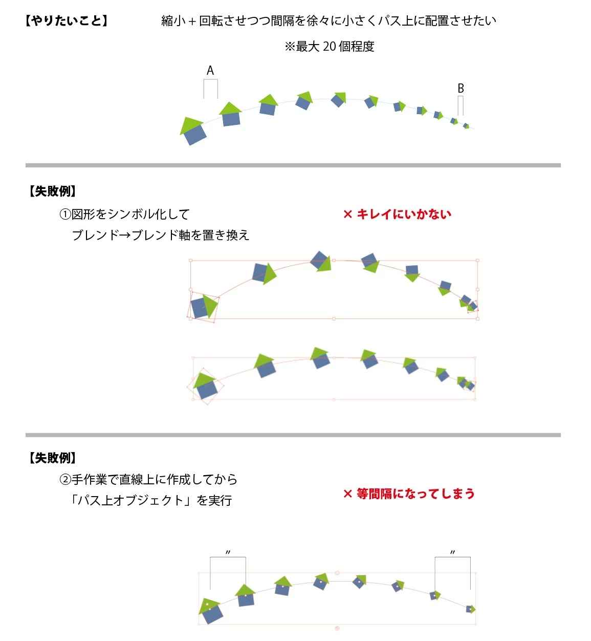 パスに沿ってオブジェクトを整列(徐々に縮小+回転)させたいです。オブジェクトが等間隔で並ぶのではなく、オブジェクト同士の隙間が縮小したサイズに応じて狭くなるようにしたいです。 縮小率と回転角度は任意で設定したいですが約80~90%、5~10°程度、パスは曲線・螺旋です。