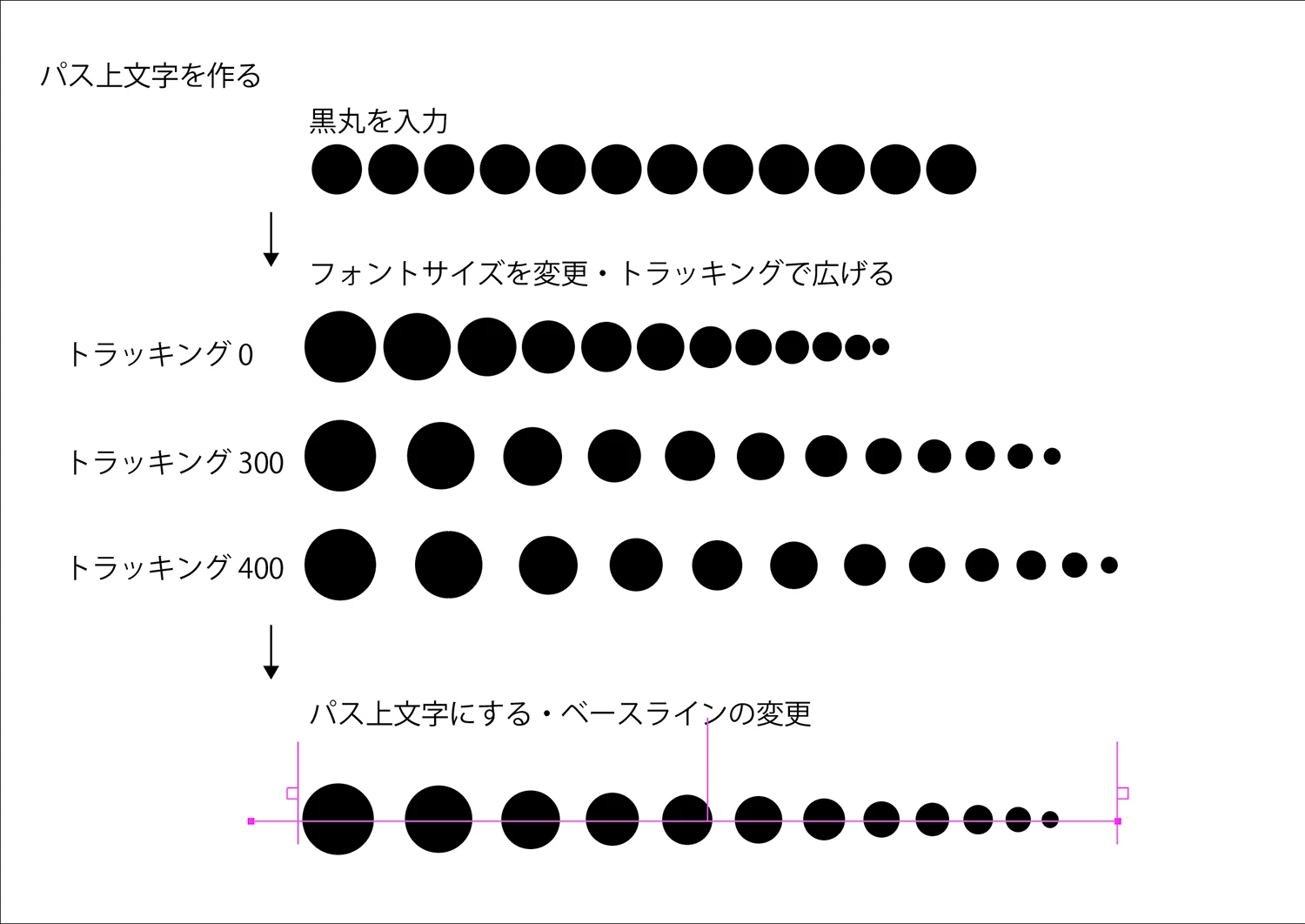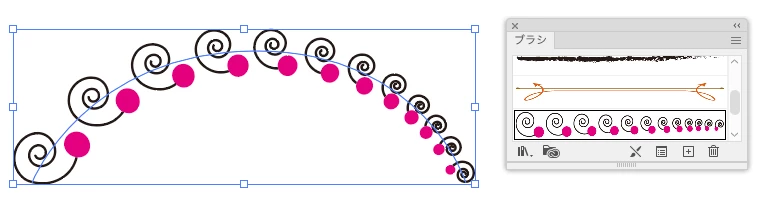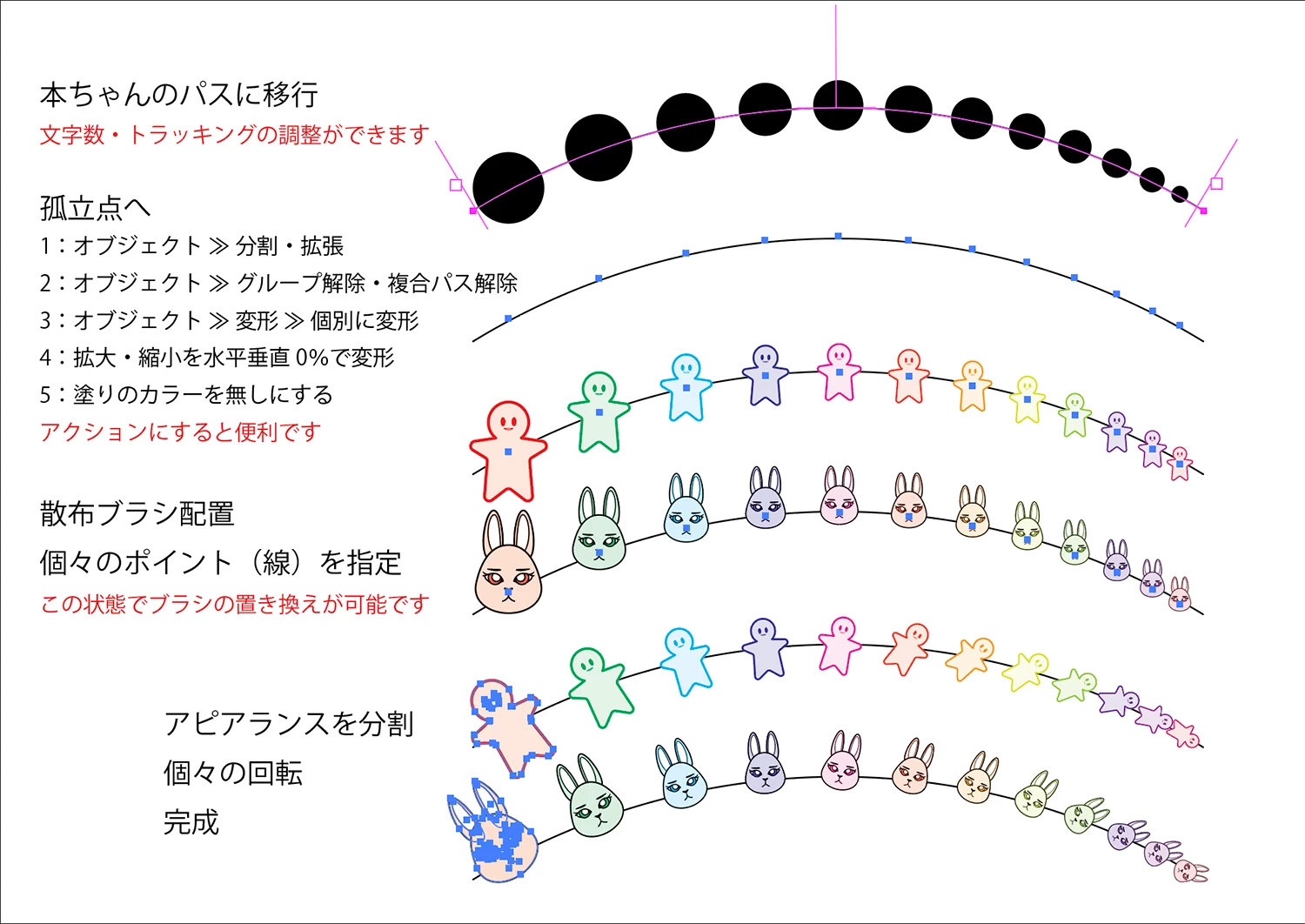 ②「移動コピー+縮小+回転」をアクション化して直列に配置>等間隔になるので手作業で配置を詰める>「パス上オブジェクト」>アタッチ>ターゲットパスをクリック