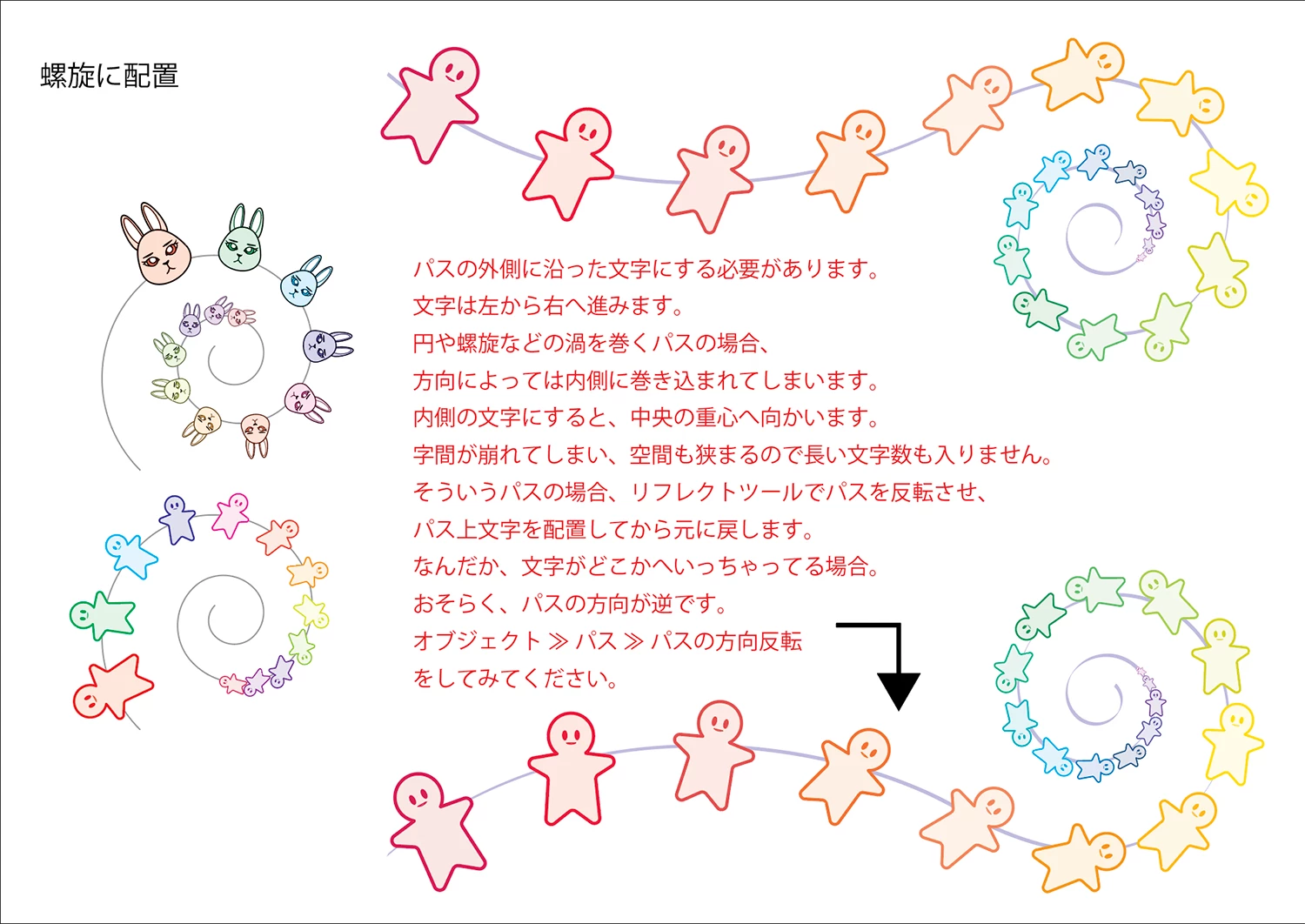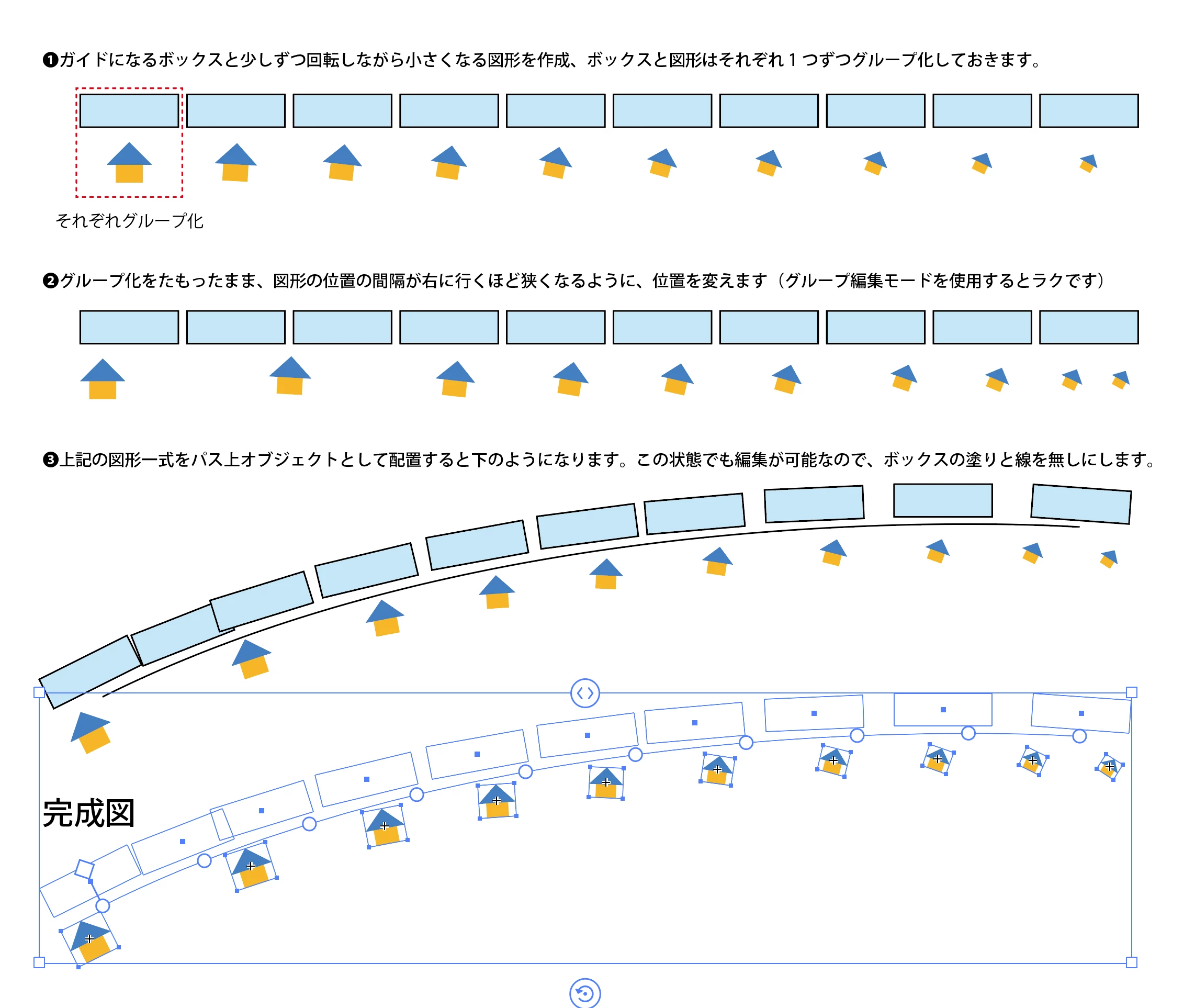 パスに沿ってオブジェクトを整列(徐々に縮小+回転)させたい
