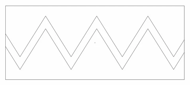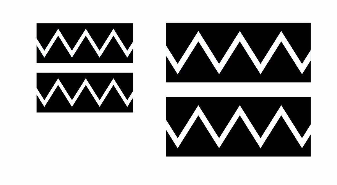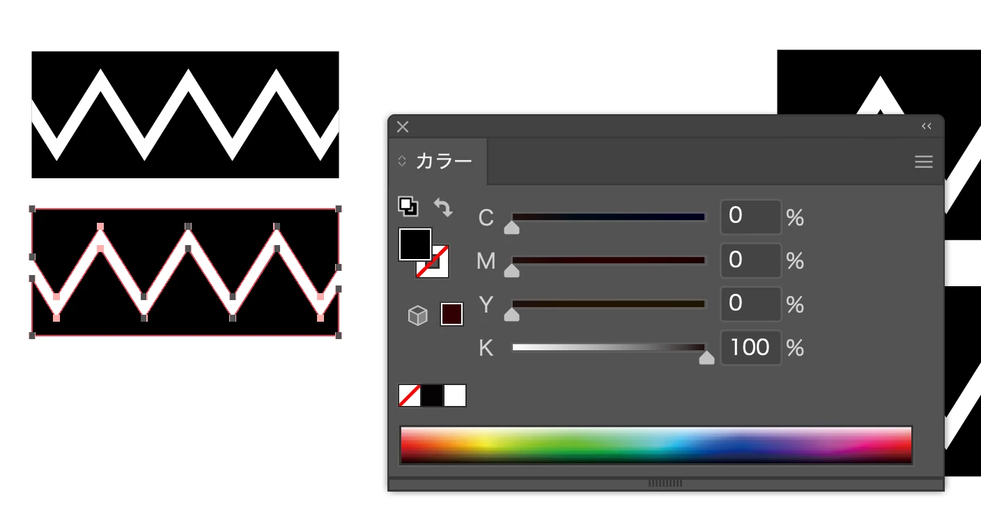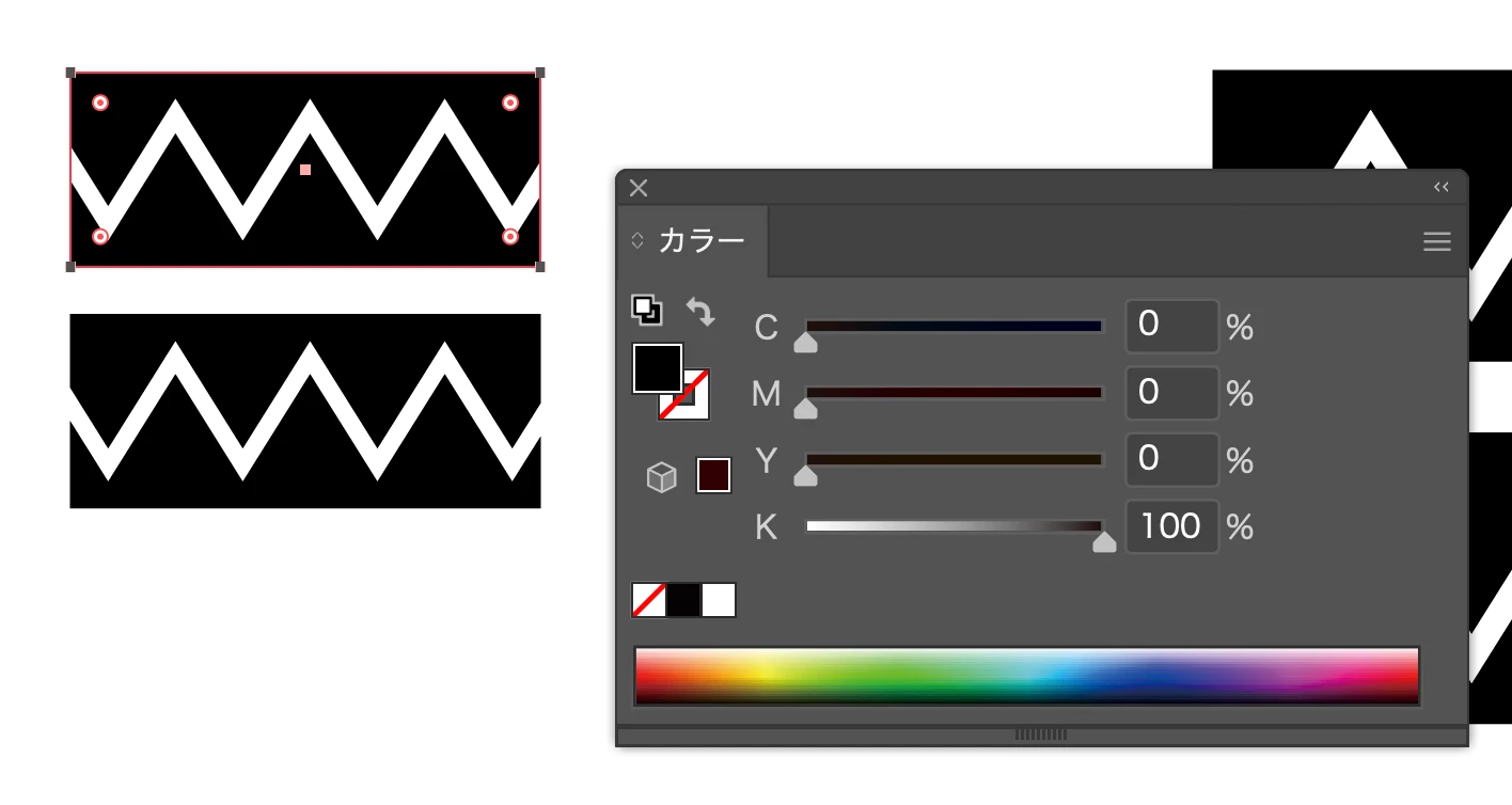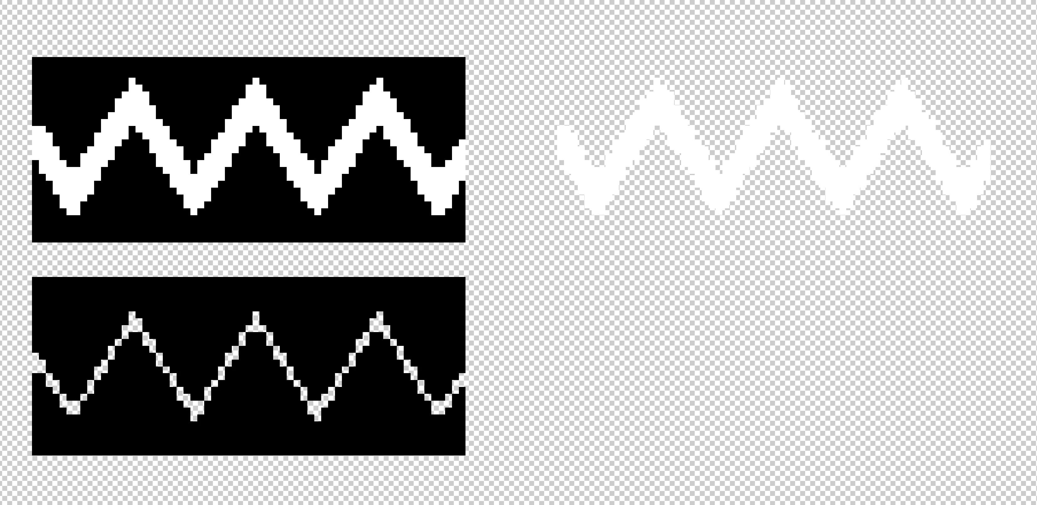 ▲各オブジェクトの構造です。上は黒い矩形に白いギザギザを重ねただけのもの(分かりやすいように少しずらしています)で、下は白いギザギザをパスファインダで完全に抜いたものです。