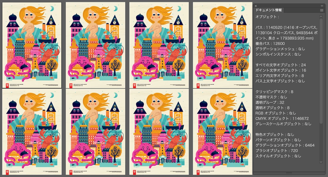 2.イラレ27.2で、例のクラッシュするデータ(以下データA)とは別で、高解像度の写真をライブトレース→拡張で、パス数約50000のデータを作り、同様に8枚コピー、移動を繰り返しました。相当に重くなりましたがクラッシュすることはありませんでした。