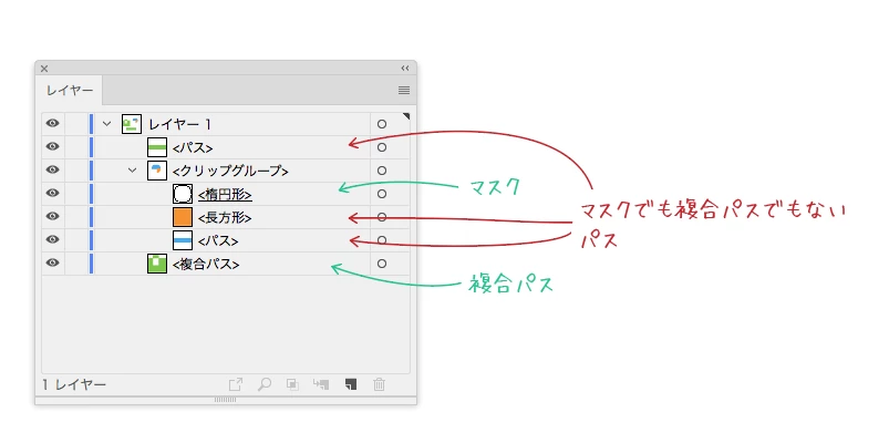 レイヤーパネルでネストレイヤーを見てみればわかります。複合パス、マスクになっているパスは以下のように見分けます。